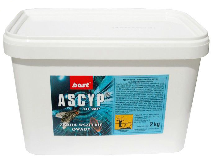 W celu zwalczania insektów proszek należy rozpuścić w proporcji: 25 g ASCYP 10 WP na każde 5 l wody. Taka porcja zawiesiny starczy na zwalczenie szkodników na powierzchni 150 m2. Zaleca się dokładne opryskanie powierzchni sufitów, krawędzie okien, drzwi, listwy podłogowe, przewody wentylacji, szpary, szczeliny, czyli główne miejsca, w których gnieżdżą się owady. Zabieg powtarzać powtarzać co dwa tygodnie, aż do całkowitego pozbycia się insektów.