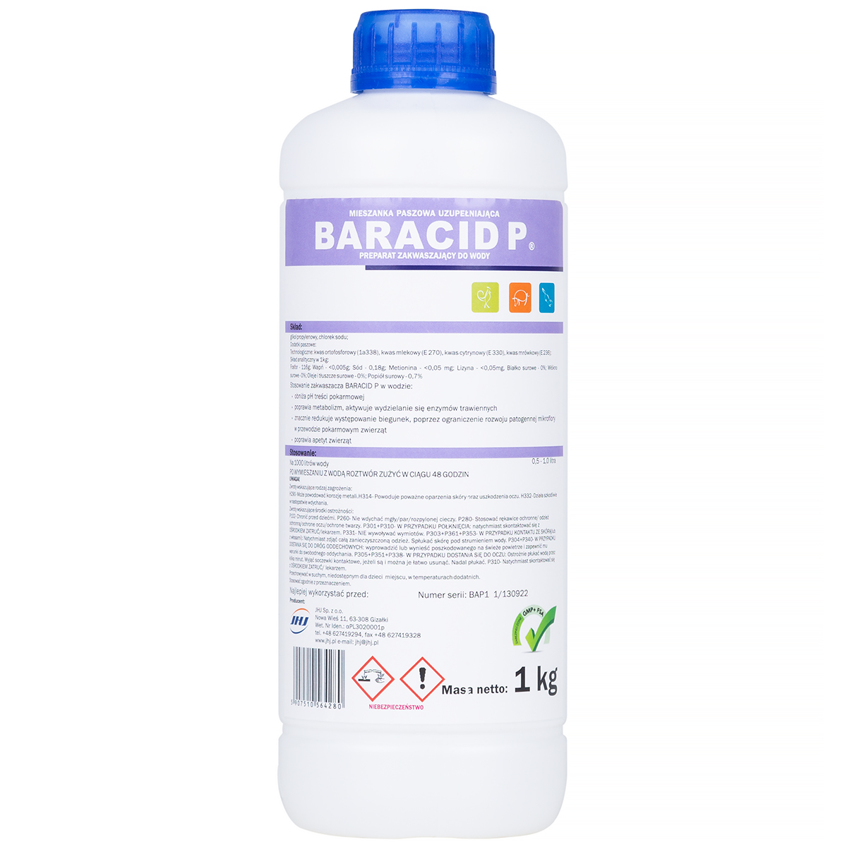 Baracid P to płynny zakwaszacz wody i paszy dla królików, drobiu i trzody chlewnej. Głównym zadaniem zakwaszacza jest ograniczenie biegunek oraz zapobieganie rozwojowi biofilmu w wodzie, poidłach i systemach pojenia. Baracid P to mieszanina różnych kwasów, które korzystnie wpływają na kondycję przewodu pokarmowego.