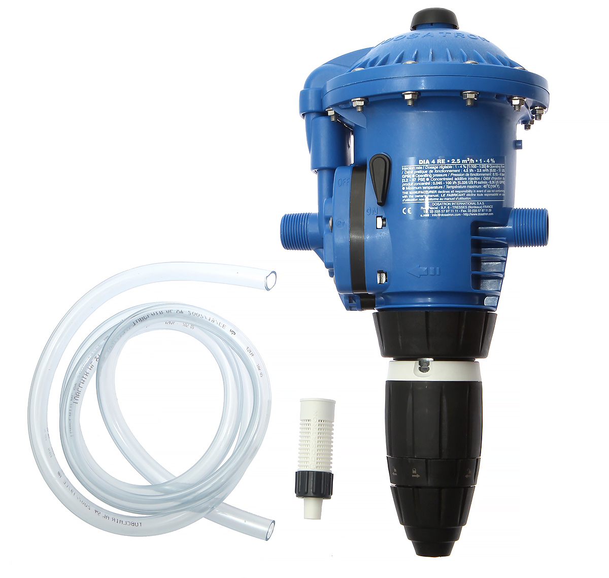 Nowoczesny dozownik leków Dosatron DIA 4 RE z układem membranowym, który zastąpił tłok spotykany w innych modelach. Dzięki temu pompa dozująca leki jest w stanie pracować na bardzo niskim ciśnieniu 0,15 Bara oraz przy niskim przepływie wody 4,5 l/h. Dozownik witamin Dosatron posiada także wbudowany układ obejścia (by-pass), dzięki któremu agresywne środki nie przepływają przez pompę i mieszane są poza mechanizmem pompy. Ma to ogromny wpływ na bezawaryjną pracę przez wiele sezonów.