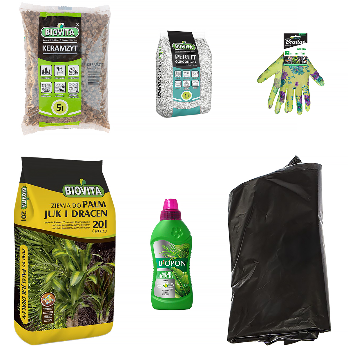 Duży zestaw do przesadzania palm to kompleks produktów, niezbędnych podczas przesadzania tych roślin najczęściej do większych donic, gdy rośliny przerastają już otwory na dnie doniczki. Palmy zazwyczaj należy przesadzać co około dwa lata, a starsze nawet rzadziej. Najpopularniejszymi palmami uprawianymi w domu są: Chamdora, Areca, Kencja i Howea.