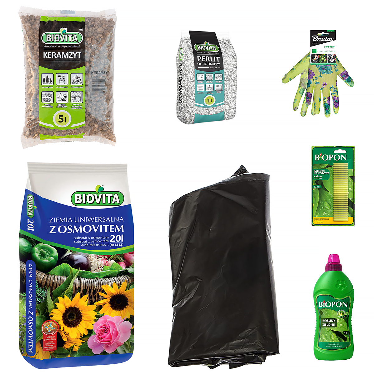 Duży zestaw do przesadzania roślin zielonych pozwala na prace ogrodowe prowadzone w domu, zawiera również zestaw preparatów i witamin do dalszej pielęgnacji roślin zielonych.