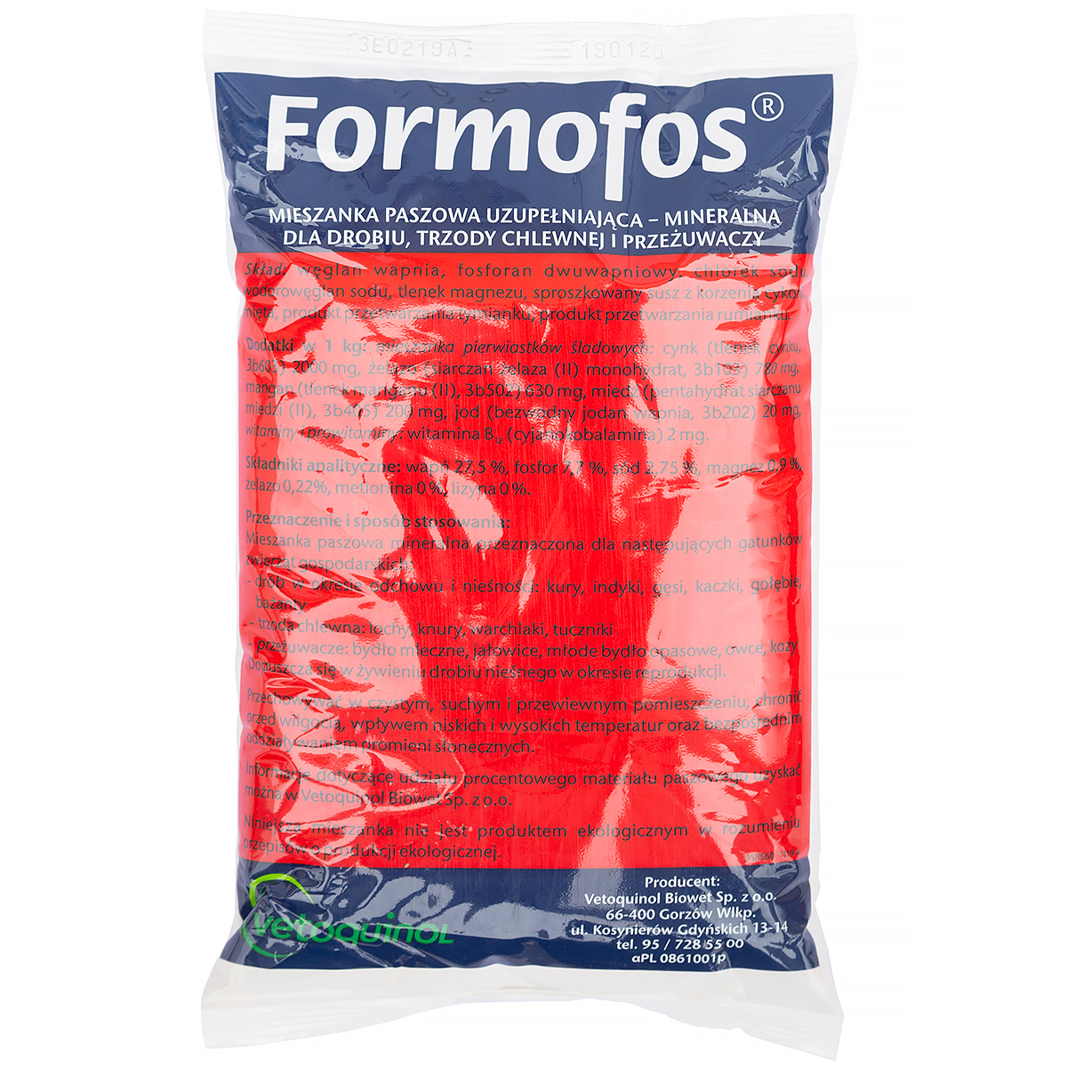 Formofos w opakowaniu 1,5 kg. To uzupełniająca mieszanka mineralna dla wszystkich gatunków zwierząt hodowlanych. Polecana szczególnie hodowcom zwierząt zagrodowych, w celu odpowiedniego zbilansowania składników pokarmowych. Mieszanka paszowa dla drobiu może być stosowana w żywieniu zwierząt na każdym etapie produkcji.
