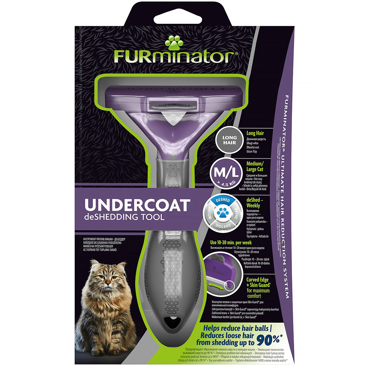 FURminator dla kotów długowłosych dużych ras - Large to niezastąpione narzędzie, które pomoże zadbać o piękną i zdrową sierść Twojego kota. Ten profesjonalny grzebień do wyczesywania podszerstka został stworzony z myślą o kotach długowłosych, zwłaszcza tych z większym ciałem. To nowoczesne zgrzebło dla kota idealnie sprawdzi się u pupili z długą sierścią, dłuższą niż 5 cm. Grzebień przystosowany jest dla czworonogów o wadze powyżej 4,5 kg. FURminator jest bardzo przydatny w okresie linienia, skutecznie je ogranicza i znacznie poprawia komfort życia zarówno kotów, jak i ich właścicieli.