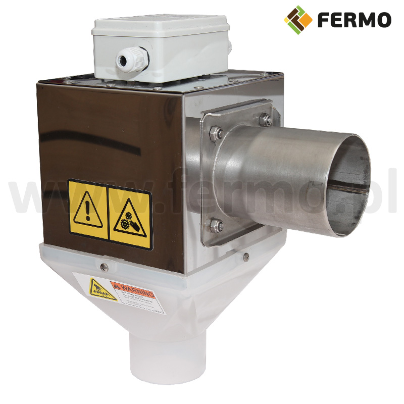 Wysokiej jakości jednostka kontrolna stosowana w automatycznych systemach karmienia drobiu. Jednostka jest montowana na końcu linii poprzecznej nad ostatnim koszem zasypowym. Oferowana jednostka dedykowana jest do linii poprzecznej z rurą fi 56 mm.Korpus jednostki oraz wyjście na rurę zostały wykonane ze stali nierdzewnej. W dolnej części znajduje się lej spustowy z tworzywa sztucznego ABS do którego montuje się rurę teleskopową. W tylnej części korpusu jednostki podłącza się motoreduktor. Jednostka kontrolna FERMO Inox-Line PLUS posiada wbudowany czujnik membranowy. Uwaga! w zestawie nie ma czujnika zbliżeniowego, można go dokupić oddzielnie! W ofercie dostępne są również jednostki sterujące FERMO na inne wielkości rur.