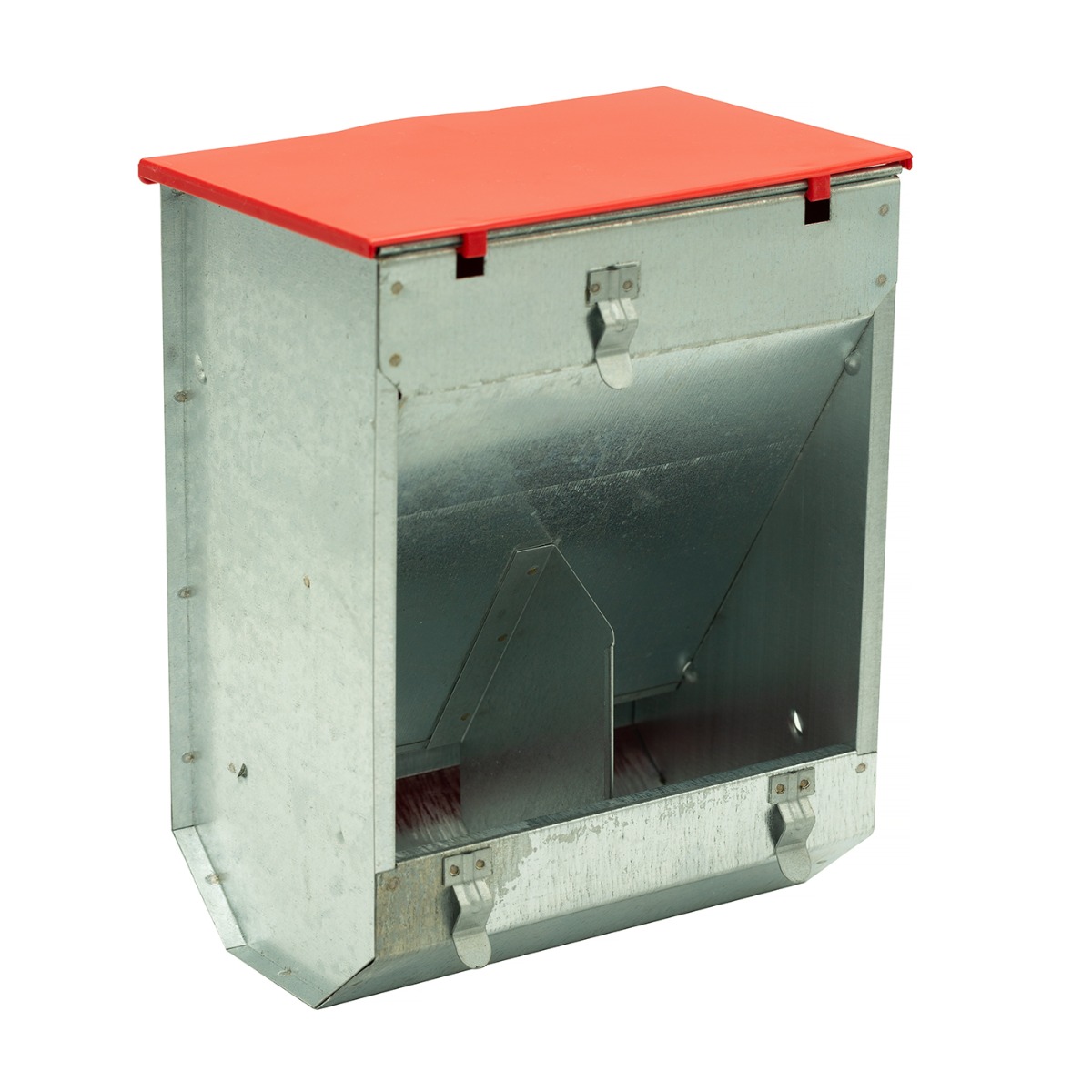 Karmnik dla królików dwukomorowy metalowy, z blachy ocynkowanej. Karmidło zostało wyposażone w pokrywkę zabezpieczającą pokarm przed zanieczyszczeniami oraz opadami, dlatego idealnie nadaje się do klatek ustawionych na dworze.