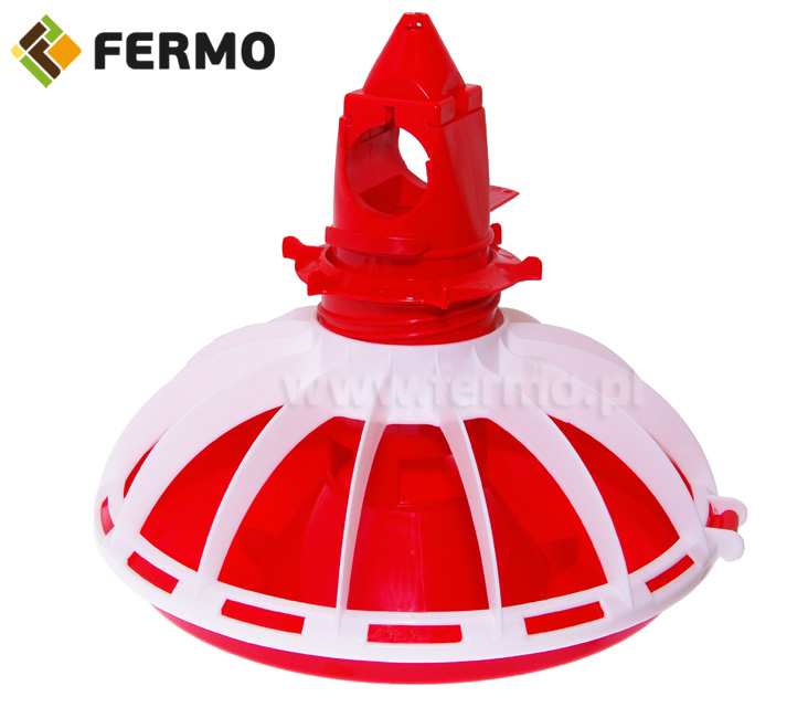 Dystrybutor do karmienia brojlerów podzielona jest na 14 stanowisk o szerokości 7cm. Pokrywa z przegrodami podłączana jest z misą za pomocą zawiasu i specjalnych zatrzasków, które solidnie utrzymują karmidło z paszą w powietrzu i uniemożliwiają otwarcie się misy. Sprawnym ruchem można je szybko otworzyć w celu wyczyszczenia czy dezynfekcji automatycznego karmidła dla kurcząt np. po zakończeniu rzutu brojlerów.
