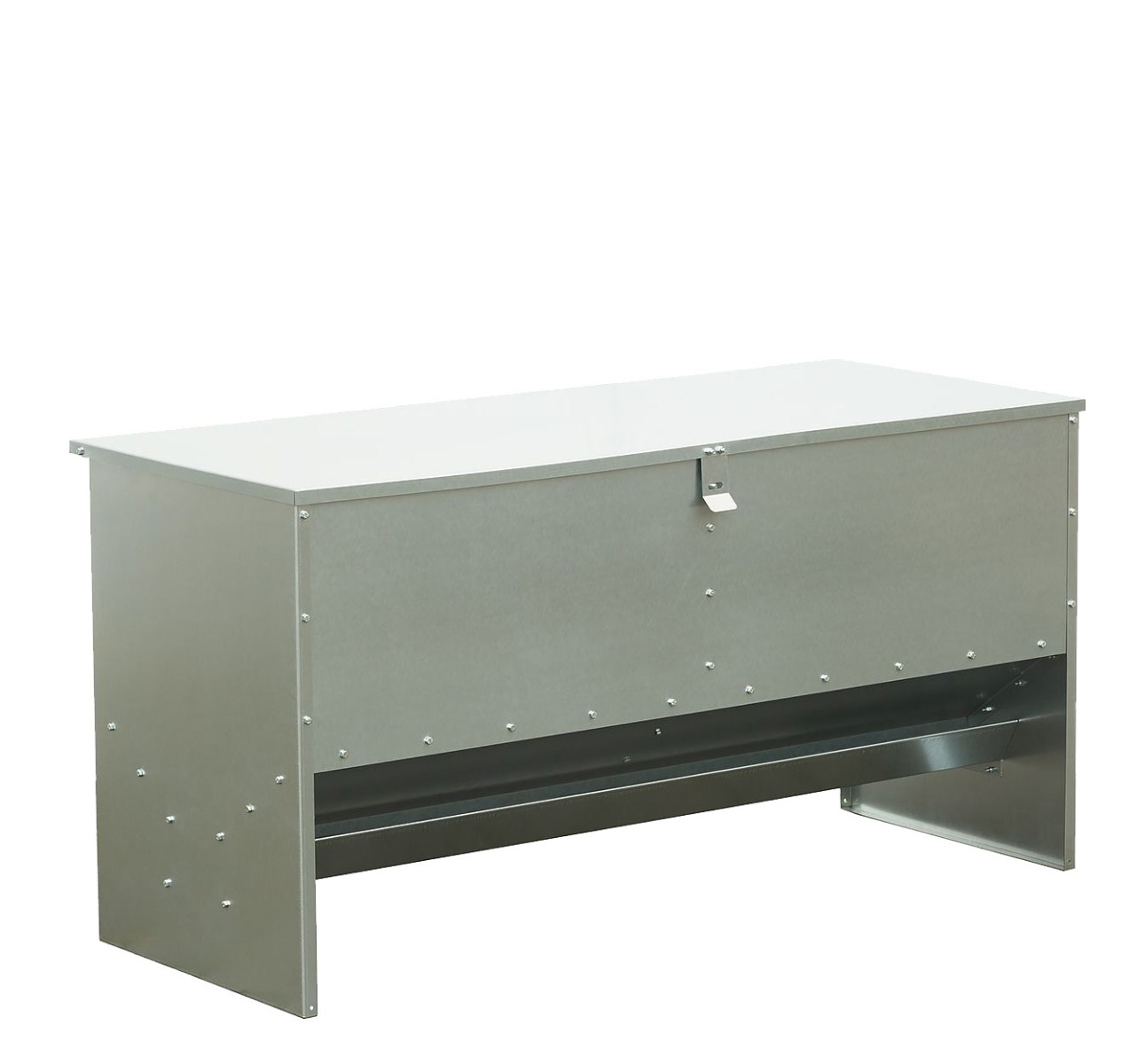 Funkcję nóg w karmidle ECO-LIFE 140 stanowią ściany szczytowe wykonane z blachy, ocynkowanej. Brzeg korytka znajduje się znajduje się na wysokości. Takie rozwiązanie skutecznie ogranicza dostęp do zawartości korytka przez myszy, co jest kluczowym parametrem dla utrzymania paszy w czystości.