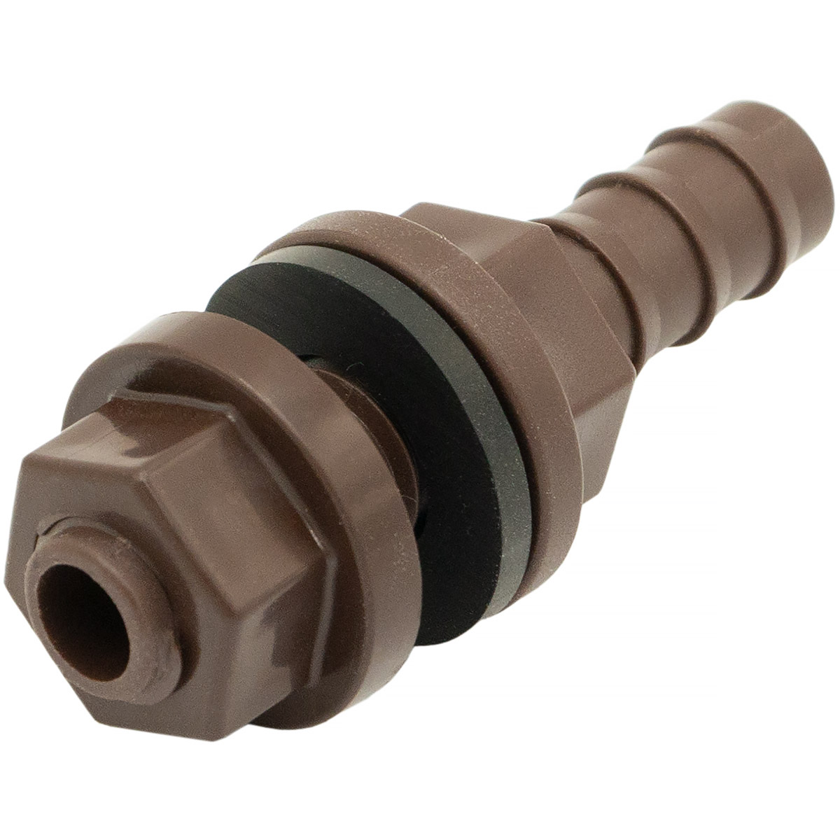 Króciec wyjściowy z nakrętką na wąż 10 mm. Króciec używany jest do połączenia zasobnika z wężykiem, który doprowadza wodę do systemu pojenia.