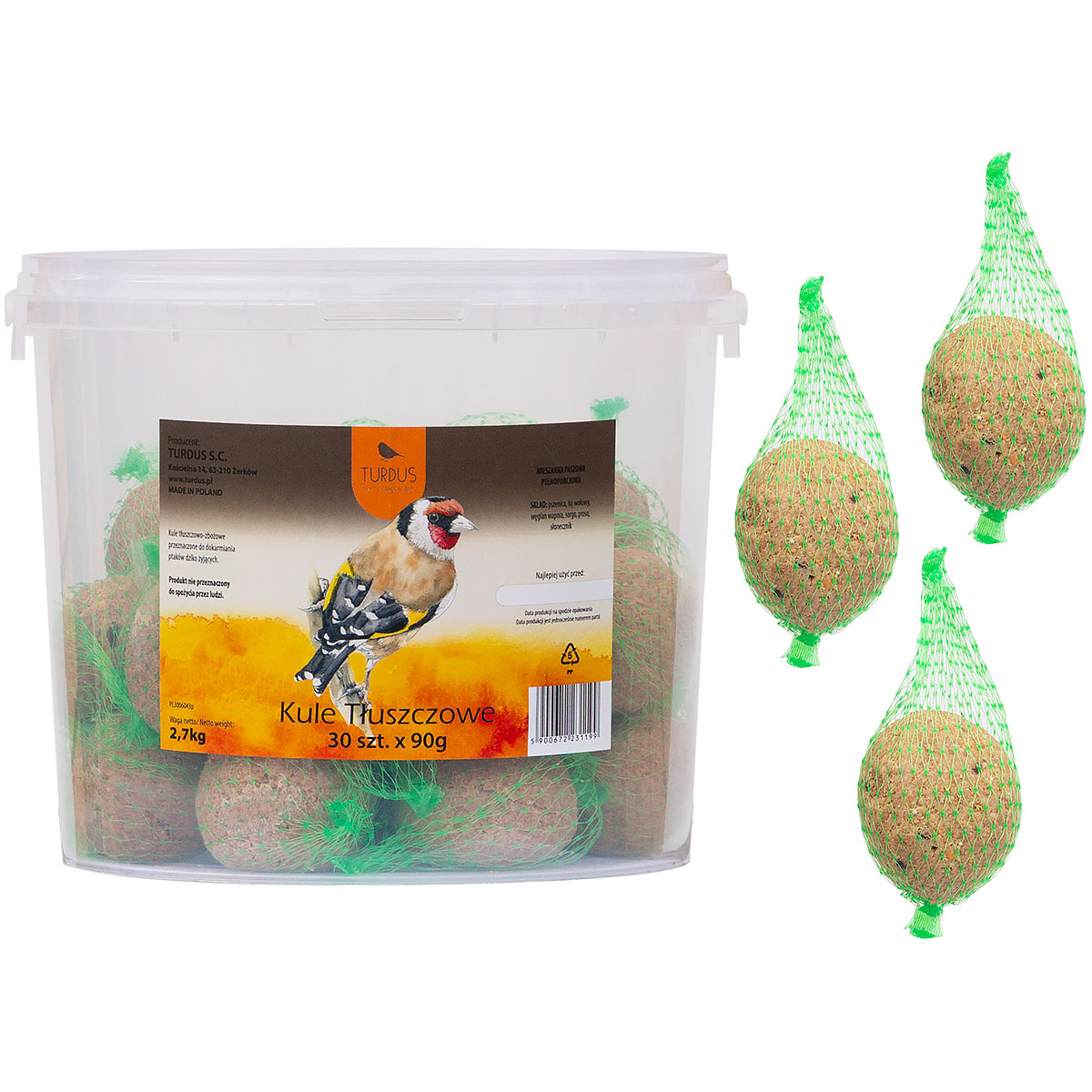 Każda kula jest umieszczone pojedynczo w siatce. Opakowanie zawiera 30 szt. karmy dla ptaków w postaci kul tłuszczowych.