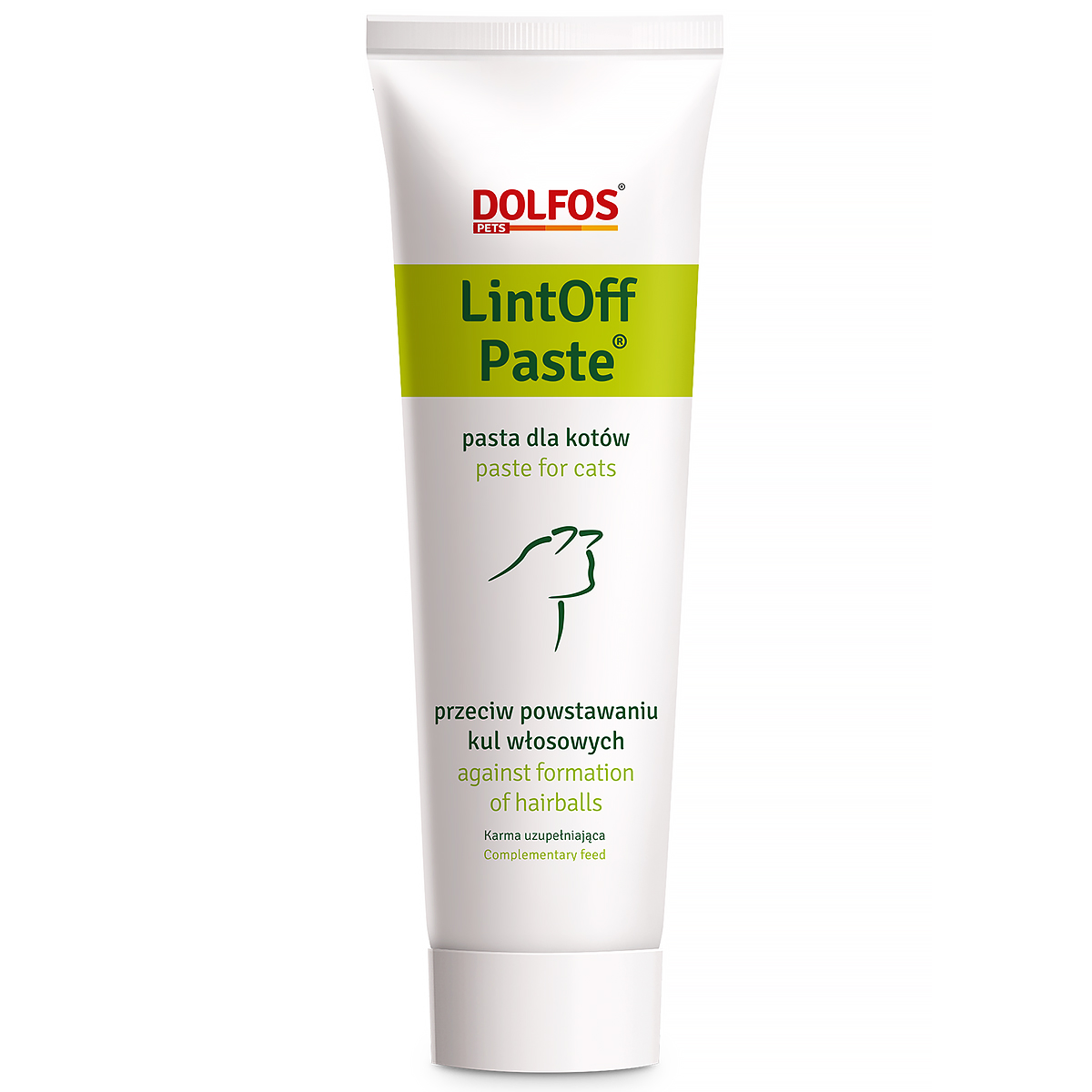 Pasta odkłaczająca dla kota LintOff Paste 100 g Dolfos to suplement diety, który ogranicza powstawanie kul włosowych w przewodzie pokarmowym mruczków. Stosowanie pasty odkłaczającej w diecie kota ma na celu wspieranie jego układu trawiennego poprzez eliminacje kłaków. Koty należą do czystych stworzeń, które całe godziny poświęcają na wylizywanie zabrudzonego futra. Połknięte podczas wylizywania martwe włosy i podszerstek z reguły zostają wydalone z kałem, jednak nie wszystko. Pozostała w żołądku sierść tworzy kule włosowe, co może prowadzić do zaburzeń przewodu pokarmowego, wymiotów, czy problemów z wydalaniem odchodów. Regularne podawanie pasty odkłaczającej wraz z karmą dla kotów, zadba o zdrowy układ pokarmowy Twojego Pupila.