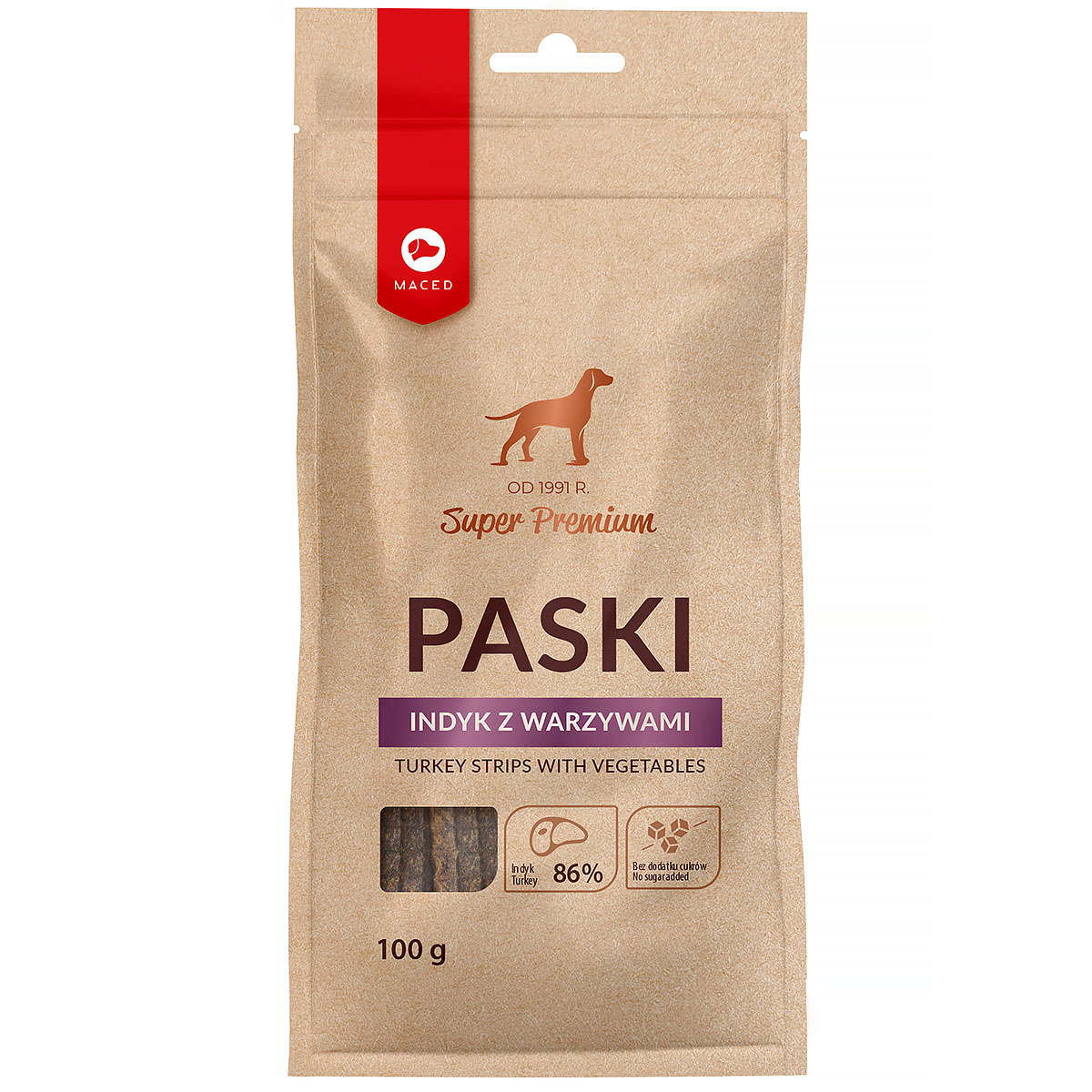 Maced mięsne paski indyk warzywa 100 g przysmak dla psa to idealna przekąska, która zadowoli każdego czworonoga. Paski to przysmak dentystyczny, który zawiera aż 86% soczystego mięsa z indyka. Bogate w wysokiej jakości białko z niewielką ilością tłuszczu sprawia, że mięsne paski są idealną i zdrową przekąską dla psa. Smak i aromat przekąski czyszczącej jamę ustną przyciągają pupili. Dieta naszych czworonogów to istotna kwestia, która wpływa na wszystkie aspekty codziennego życia psów. Posiłki zwierząt muszą być zbilansowane, różnorodne i dostarczać wszystkich niezbędnych witamin i składników mineralnych.