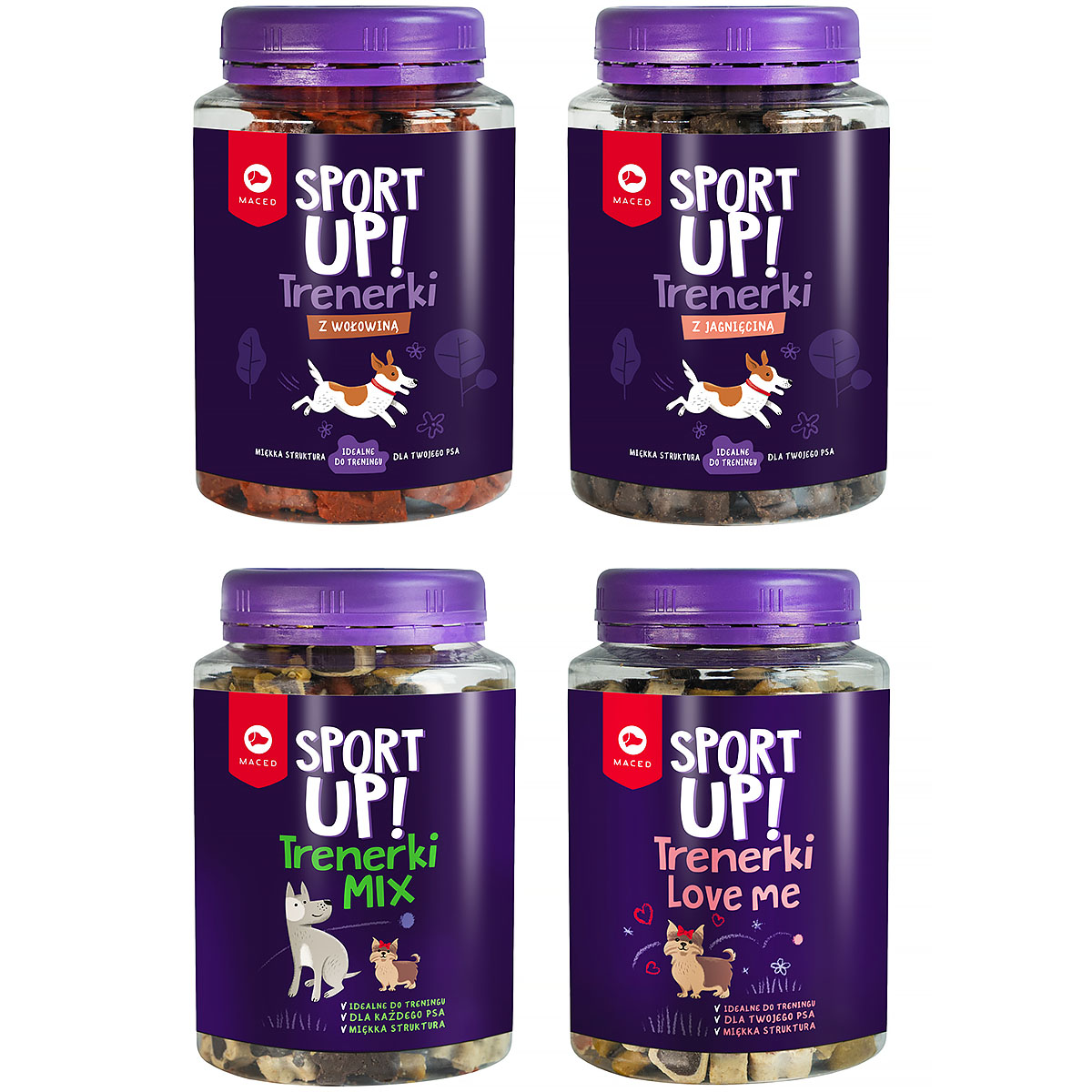 Trenerki Maced to przekąska dla Twojego psa, która idealnie sprawdzi się podczas treningów lub zabawy. Zestaw 4 opakowań smakołyków to spory zapas wystarczający na długi czas. Miękka tekstura będzie odpowiednia dla wszystkich ras psów. Kupując zestaw 4 opakowań dostajemy 2 słoiczki przysmaków w różnych smakach, 1 słoiczek o smaku jagnięciny i 1 o smaku wołowiny. Każde opakowanie to 300 g smakołyków w różnych kształtach i pysznych smakach.