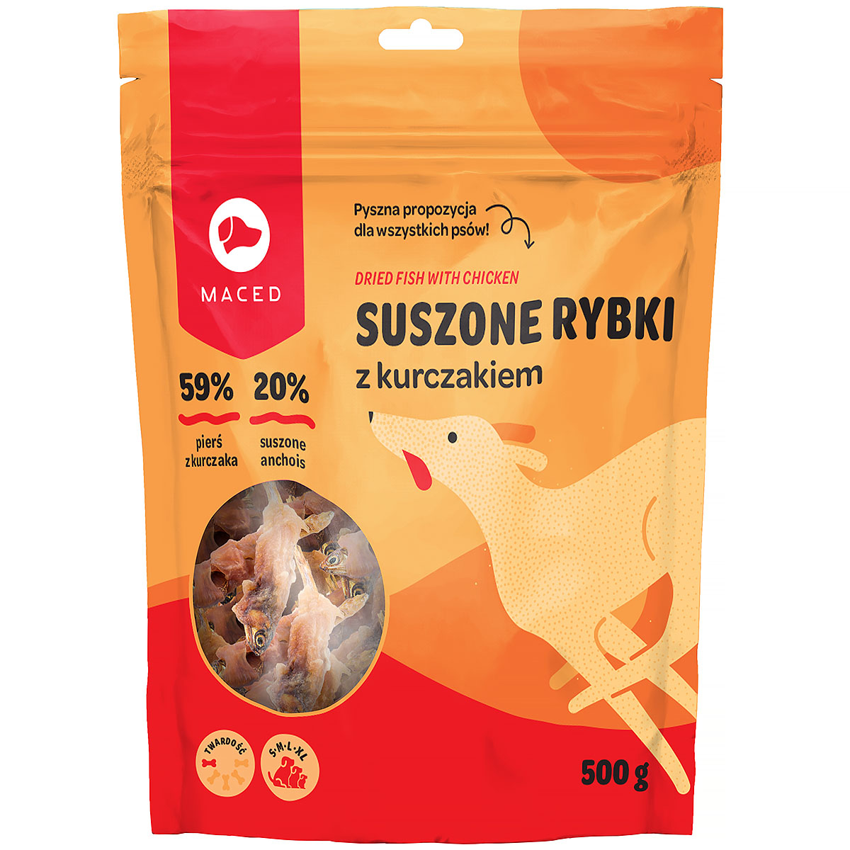 Maced suszona rybka z kurczakiem 0,5 kg to w 100% naturalna przekąska w formie szprotek owiniętych mięsem z kurczaka przeznaczona szczególnie dla psów małych ras, ale z pewnością można ją podawać wszystkim pupilom. Przysmak jest idealnym uzupełnieniem codziennej diety psa.