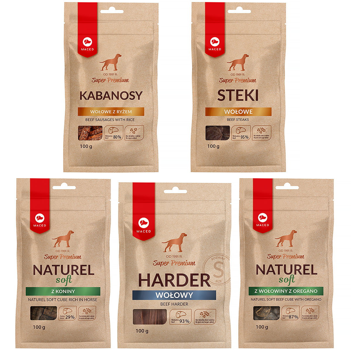 Zestaw przysmaków Premium dla psa MACED 5 x 100 g. Zdrowe i wysokojakościowe przysmaki dla psów wszystkich ras. Przekąski dla psa między posiłkami lub jako przysmak treserski.
