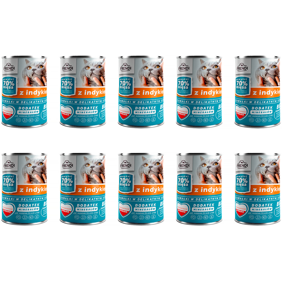 Mokra karma dla kota FRENDI w sosie z indykiem zestaw 10 x 400 g to doskonały wybór dla Twojego ukochanego pupila. Ten wyjątkowy posiłek dostarcza nie tylko doskonałego smaku, ale także wiele korzyści zdrowotnych. Starannie zbilansowany i smaczny pokarm dla kota to źródło niezbędnych składników odżywczych, które pomagają utrzymać zdrowie i witalność Twojego pupila. Znajdziesz w niej białko, tłuszcze, witaminy i minerały, które są niezbędne do prawidłowego funkcjonowania organizmu czworonogów.