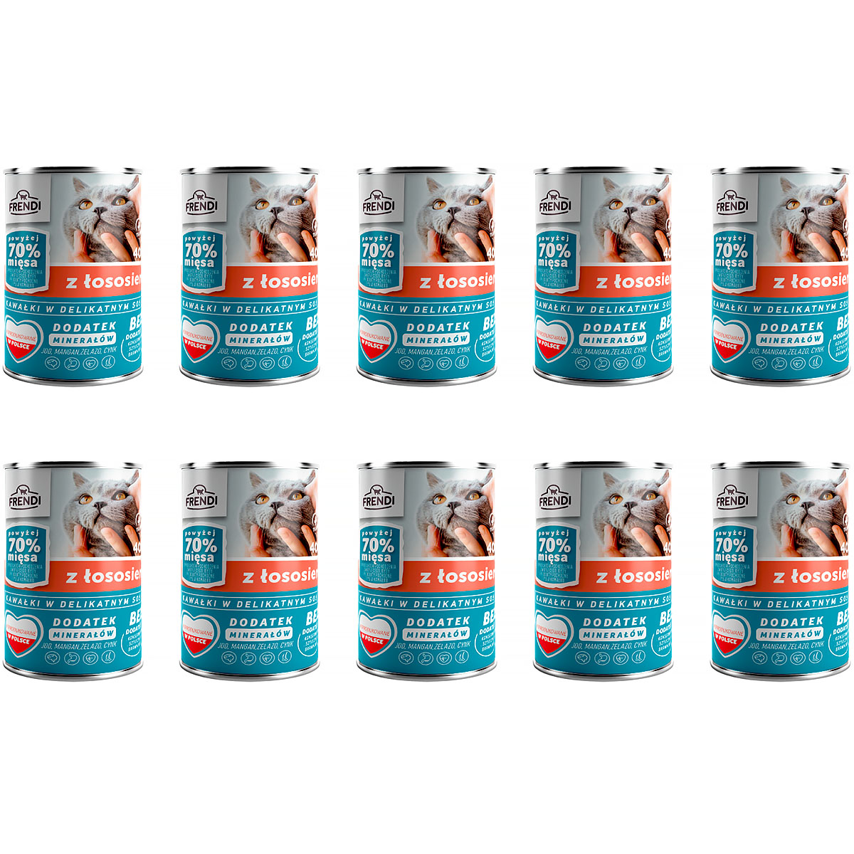 Mokra karma dla kota FRENDI w sosie z łososiem zestaw 10 x 400 g to wyjątkowo zbilansowany i pełnowartościowy posiłek dostępny w wygodnym zestawie dla dorosłych kotów. Twój futrzasty przyjaciel zasługuje na codzienną dawkę zdrowia i wyjątkowego smaku, dlatego ta karma jest idealnym rozwiązaniem. Codzienna dieta kotów musi zawierać składniki odżywcze najwyższej jakości, które spełnią ich unikalne potrzeby, a produkt FRENDI gwarantuje dostarczenie szerokiego spektrum witamin, minerałów i składników odżywczych, które są niezbędne do prawidłowego rozwoju. Niezależnie od rasy, ta karma stanowi doskonałe uzupełnienie codziennej diety dorosłych kotów.