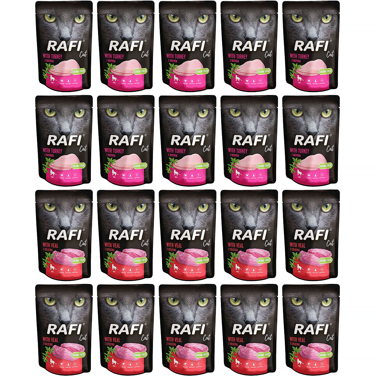 Mix mokrej karmy RAFI to nie tylko wyśmienity smak, ale także zaawansowana receptura, wolna od zbóż, konserwantów, barwników, sztucznych aromatów i polepszaczy smaku. Dzięki temu pokarm spełnia najwyższe standardy żywieniowe, gwarantując, że każda porcja dostarcza niezbędnych składników odżywczych dla zdrowego życia Twojego kota. Oferując mieszankę indyka i cielęciny, karma wspiera naturalne potrzeby żywieniowe kotów.