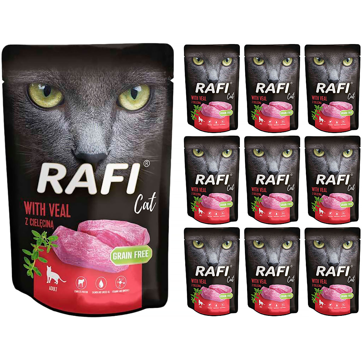 Mokra karma dla kota Rafi z cielęciną 10 x 100 g to wyjątkowe doświadczenie smakowe, które idzie w parze z bogactwem wartości odżywczych. Ten pełnoporcjowy posiłek, starannie opracowany przez specjalistów, dostarcza nie tylko wyjątkowego smaku, ale także kompleksowych korzyści zdrowotnych dla Twojego kota.