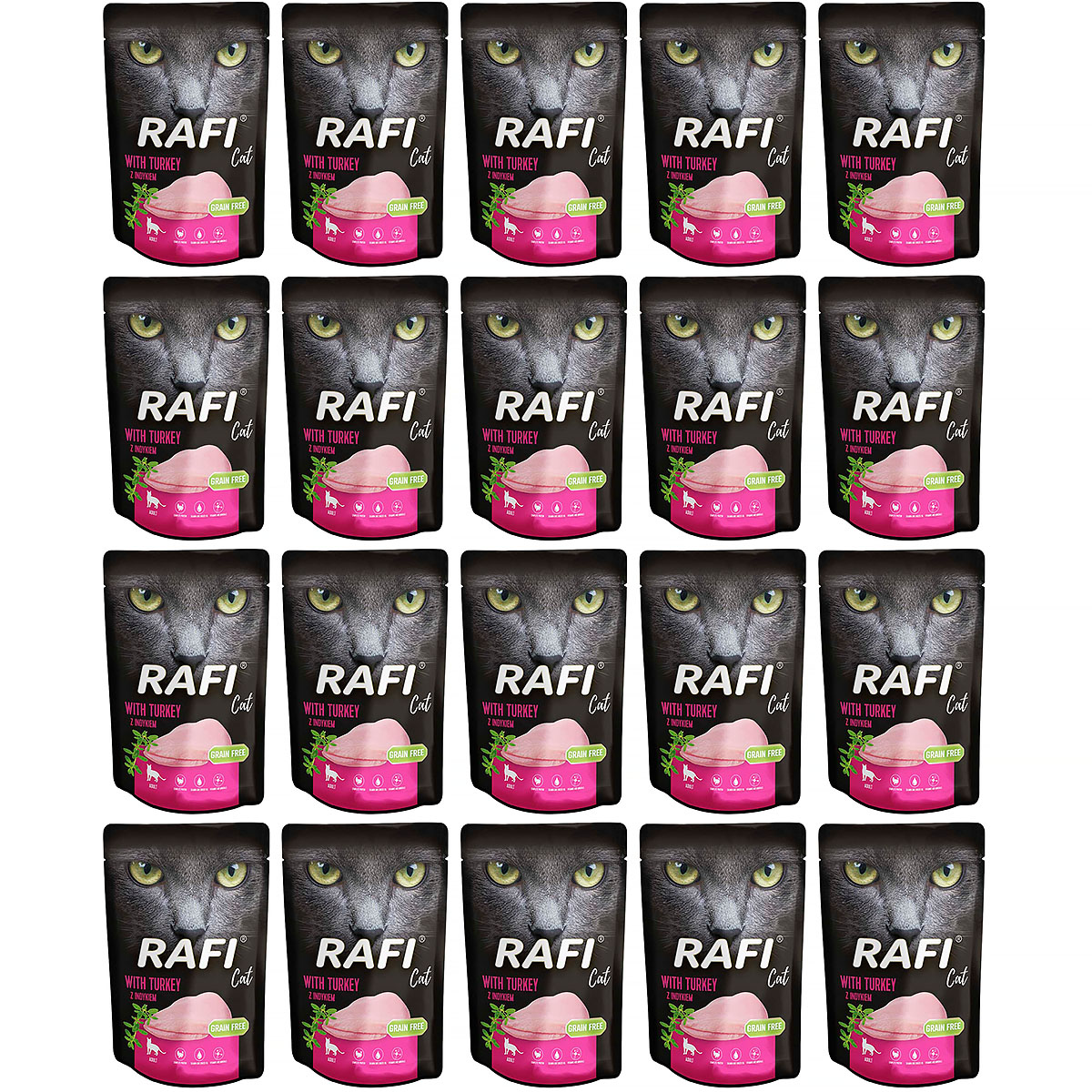 Zestaw 20 saszetek z indykiem to nie tylko praktyczne rozwiązanie dla właścicieli kotów, ale także gwarancja, że Twój kot otrzymuje pełnowartościowy posiłek przy każdym podaniu. Starannie zapakowane saszetki zachowują świeżość i smak, a ich zawartość dostarcza kompleksowej gamy składników odżywczych, wspierając zdrowie i dobre samopoczucie Twojego kota. Podaruj swojemu kotu niezapomniane doznania kulinarno-zdrowotne z karmą Rafi z indykiem.