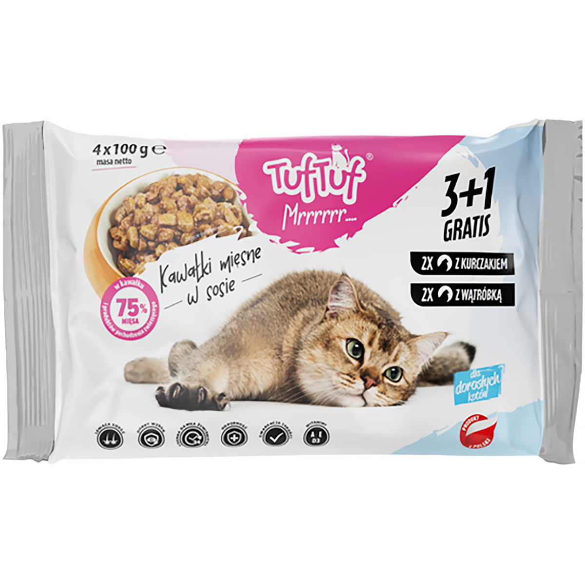 Mokra karma dla kota TUF TUF saszetki kurczak, wątróbka 4 x 100 g to mini zestaw wyjątkowo smacznej i odżywczej mokrej karmy dla kota. Opakowanie zawiera aż cztery saszetki w dwóch różnych smakach. Każda z doskonale zbilansowanych i zapakowanych w wygodne i praktyczne saszetki to połączenie wysokiej jakości składników, które tworzą niezapomniany dla twojego kota posiłek.