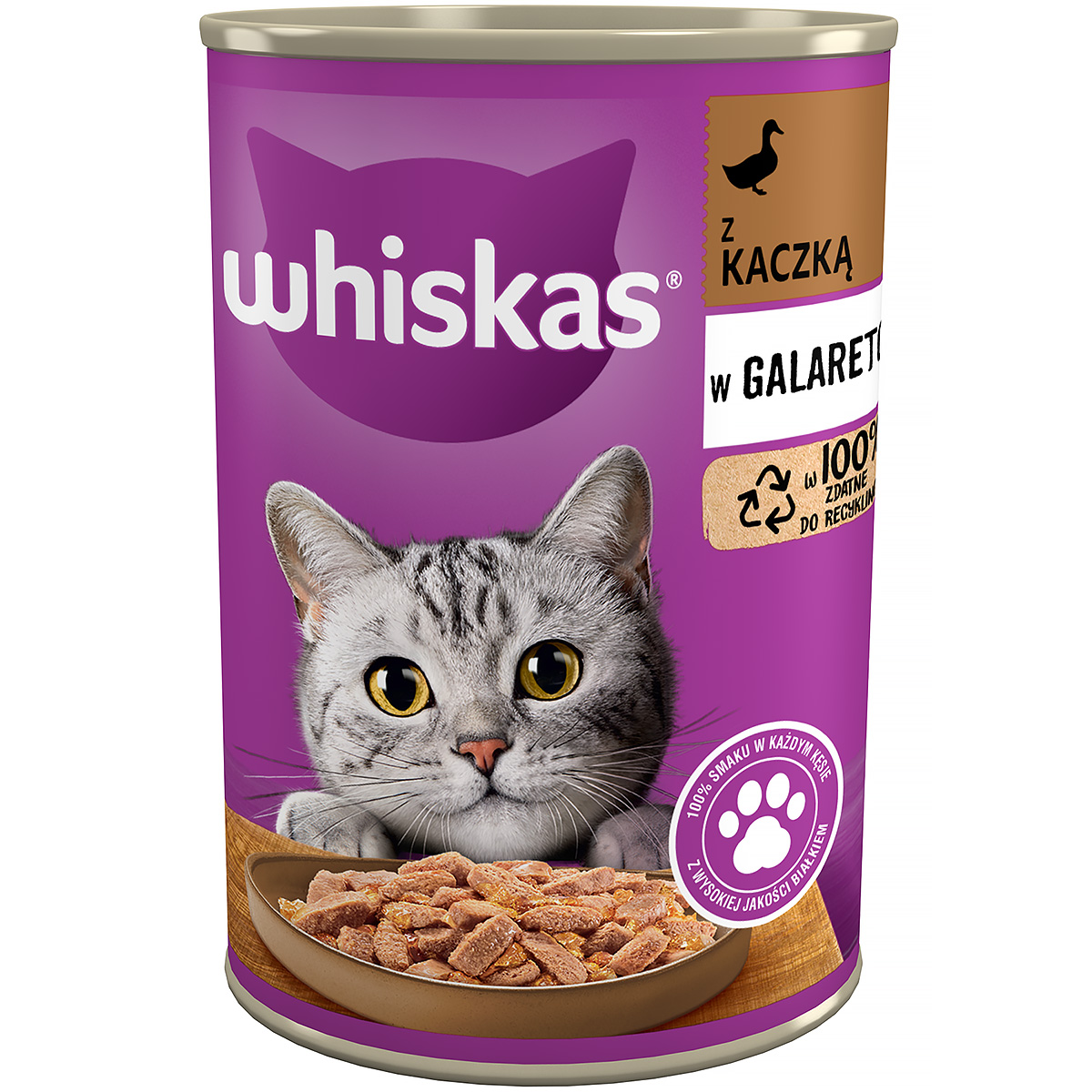 Mokra karma od Whiskas ma w sobie mnóstwo kawałków z kaczki, która posiada wyrazisty aromat i niecodzienny smak. Kotu trudno będzie się oprzeć! W puszce karmy Whiskas znajduje się 40% kaczego mięsa w kawałkach zawieszonych w galarecie. Całość smakuje kotu, a żołądek i jelita łatwo trawią całą mieszankę.