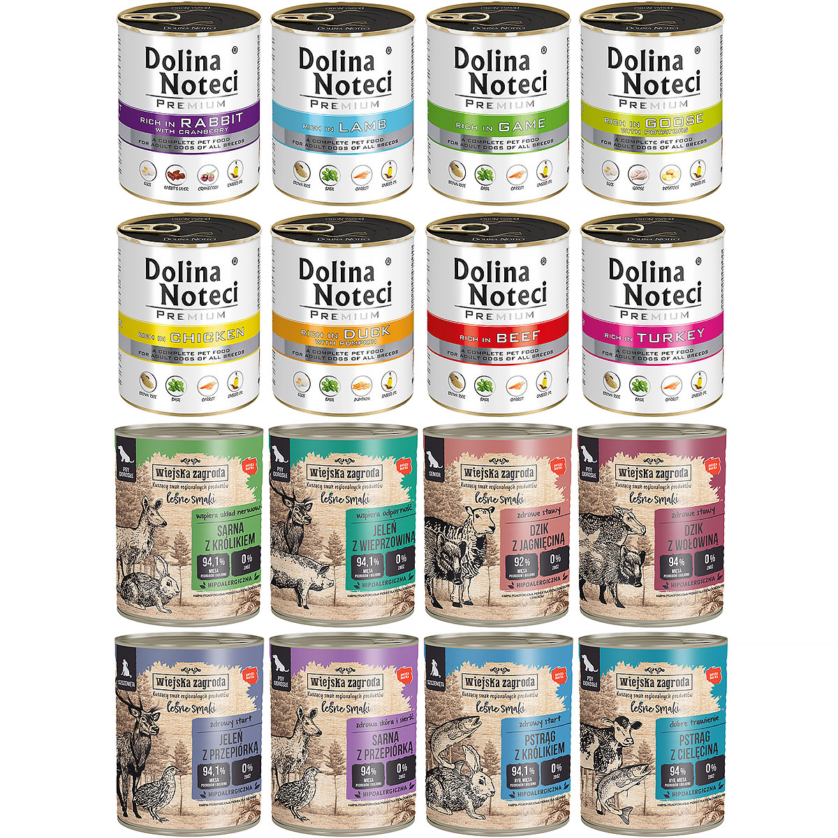 Mokra karma dla psa Dolina Noteci Premium Wiejska Zagroda Leśne smaki mix zestaw 16 x 800 g to doskonała propozycja dla wszystkich właścicieli czworonogów, którzy pragną zapewnić swoim pupilom wyjątkowe doznania smakowe, równocześnie dbając o ich pełnowartościową dietę. Ten zestaw składa się z dwóch renomowanych marek - Dolina Noteci i Wiejska Zagroda, oferujących różnorodne smaki i bogactwo składników odżywczych.