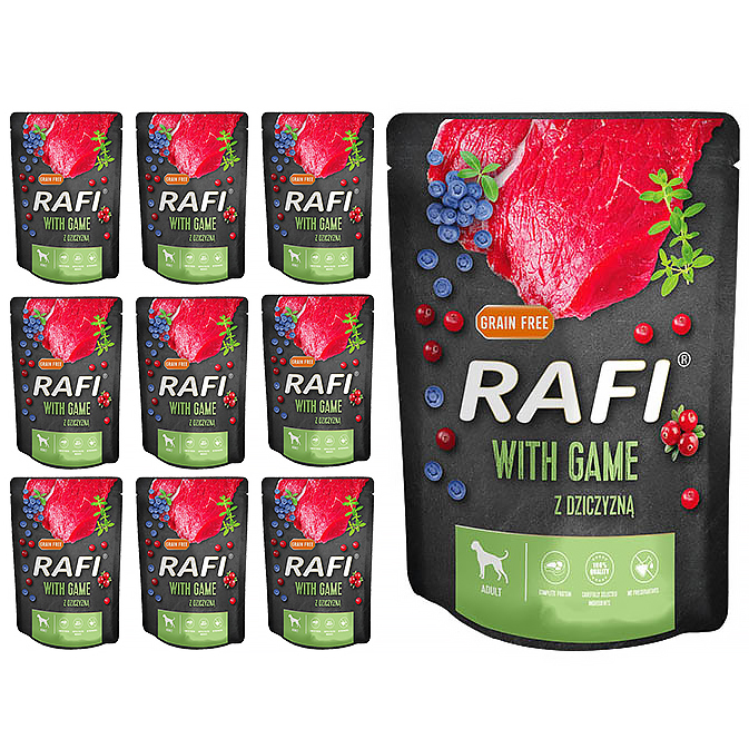Mokra karma dla psa RAFI z dziczyzną w zestawie 10 x 300g. Pełnoporcjowa mokra karma przeznaczona jest dla dorosłych psów wszystkich ras. Pokarm dla psów zamknięto w wygodnych saszetkach o wadze 300 g dzięki czemu są wygodne w karmieniu, jak i przechowywaniu.