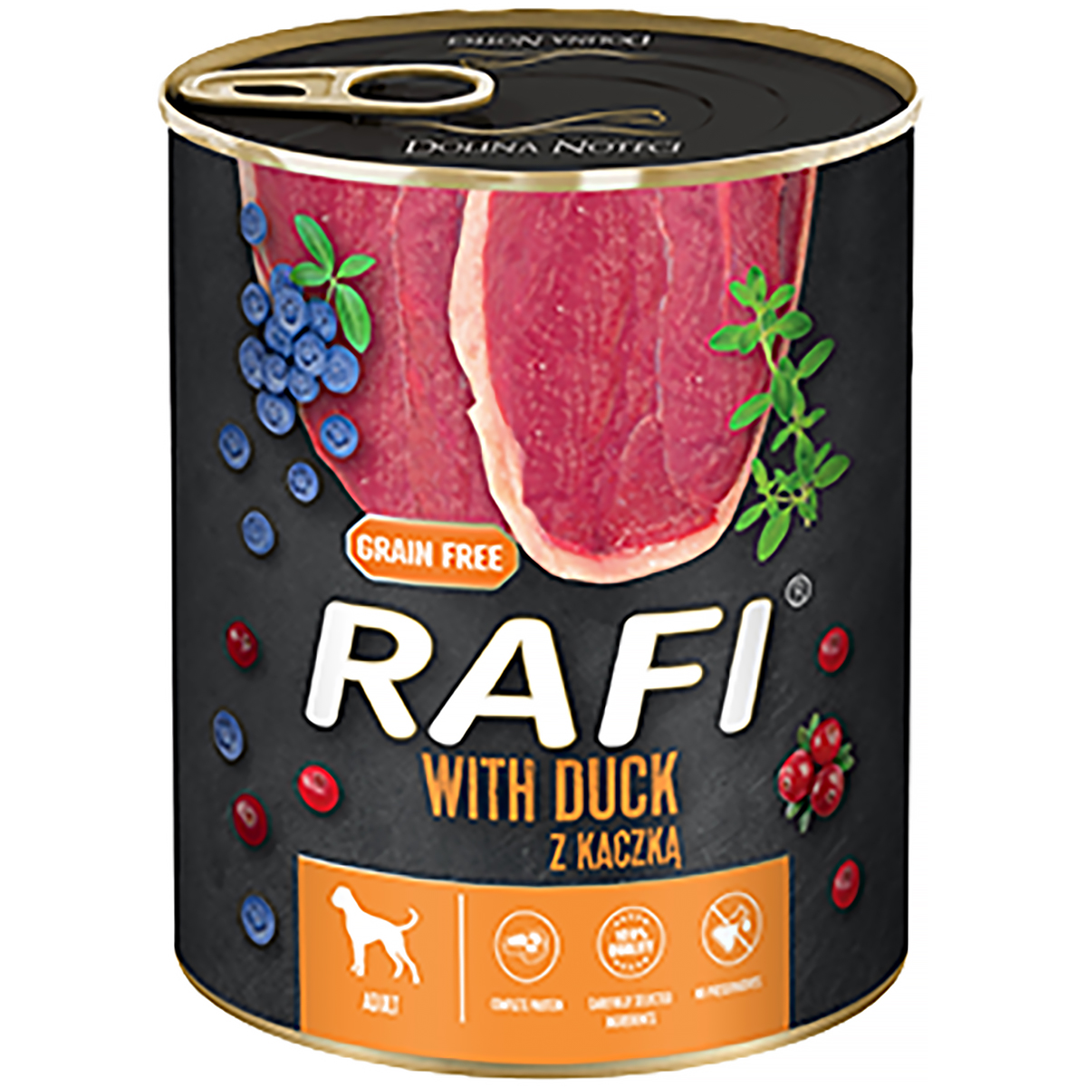Prezentowana karma Rafi z kaczką została zamknięta w wygodnej puszce o pojemności 800 g. Puszka Rafi 800 g jest bezzbożowa, a także wolna od barwników, sztucznych konserwantów oraz barwników. Dodatek tymianku wpływa na zwiększenie atrakcyjności karmy pod kątem smaku i zapachu, dzięki czemu psy chętnie ją pobierają. Natomiast dodatek w postaci borówek chroni przed wolnymi rodnikami, a żurawina chroni zwierzęta przed infekcjami dróg moczowych.