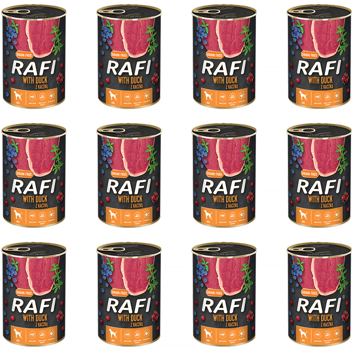 Mokra karma dla psa RAFI z kaczką zestaw w puszkach 12 x 400 g to wyjątkowy zestaw, stworzony z myślą o