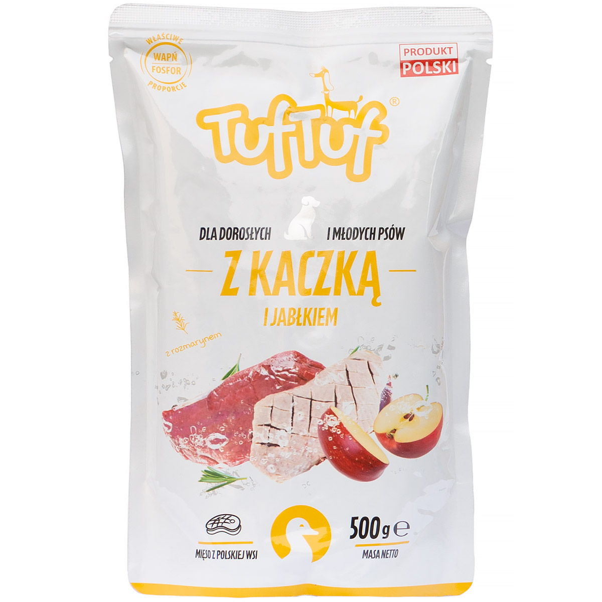 Mokra karma dla psa TUF TUF mielonka kaczka z jabłkiem 500g to wyjątkowa uczta smakowa twojego psa, w której połączono smak delikatnego mięsa z kaczki z słodkim i delikatnie kwaśnym smakiem jabłka. Aromat i niespotykany smak zaspokoi potrzeby wszystkich psów. Psi obiad zamknięty w szczelnej i trwałej saszetce gwarantuje świeżość na długo. Dodatkowo mielonka TUF TUF idealnie sprawdzi się jako codzienny pokarm, ale również jako przysmak podawany w zabawkach do wylizywania.