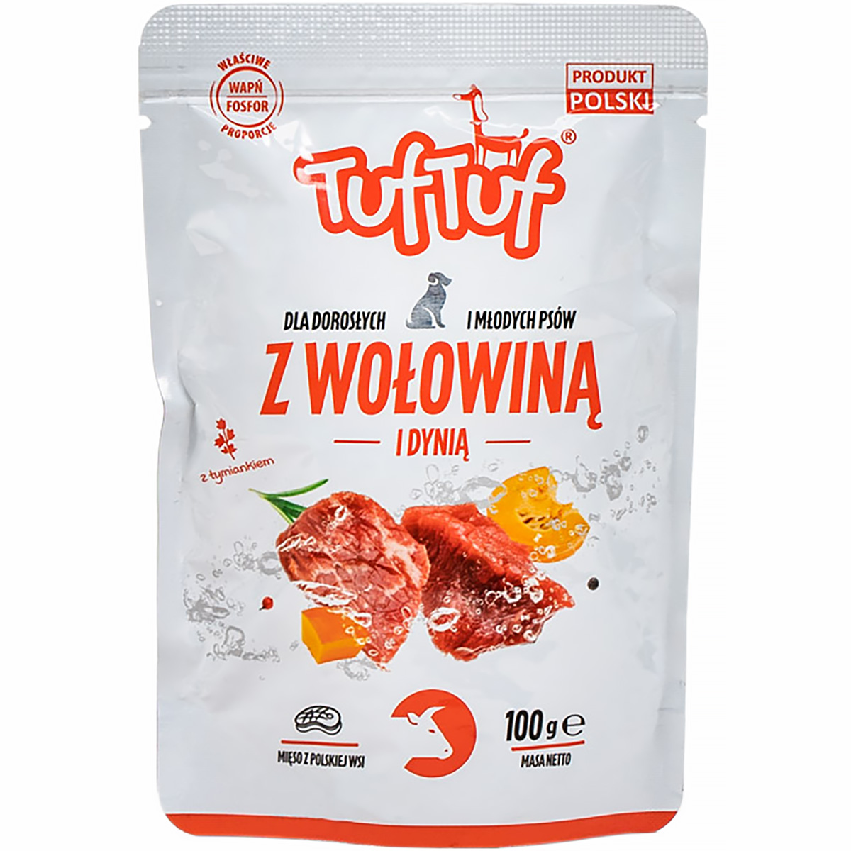 Mokra karma dla psa TUF TUF mielonka wołowina z dynią 100 g to wyjątkowa pełnowartościowa karma, która dostarcza zdrowego i doskonale zrównoważonego pożywienia, mającego korzystny wpływ na organizmy naszych pupili.