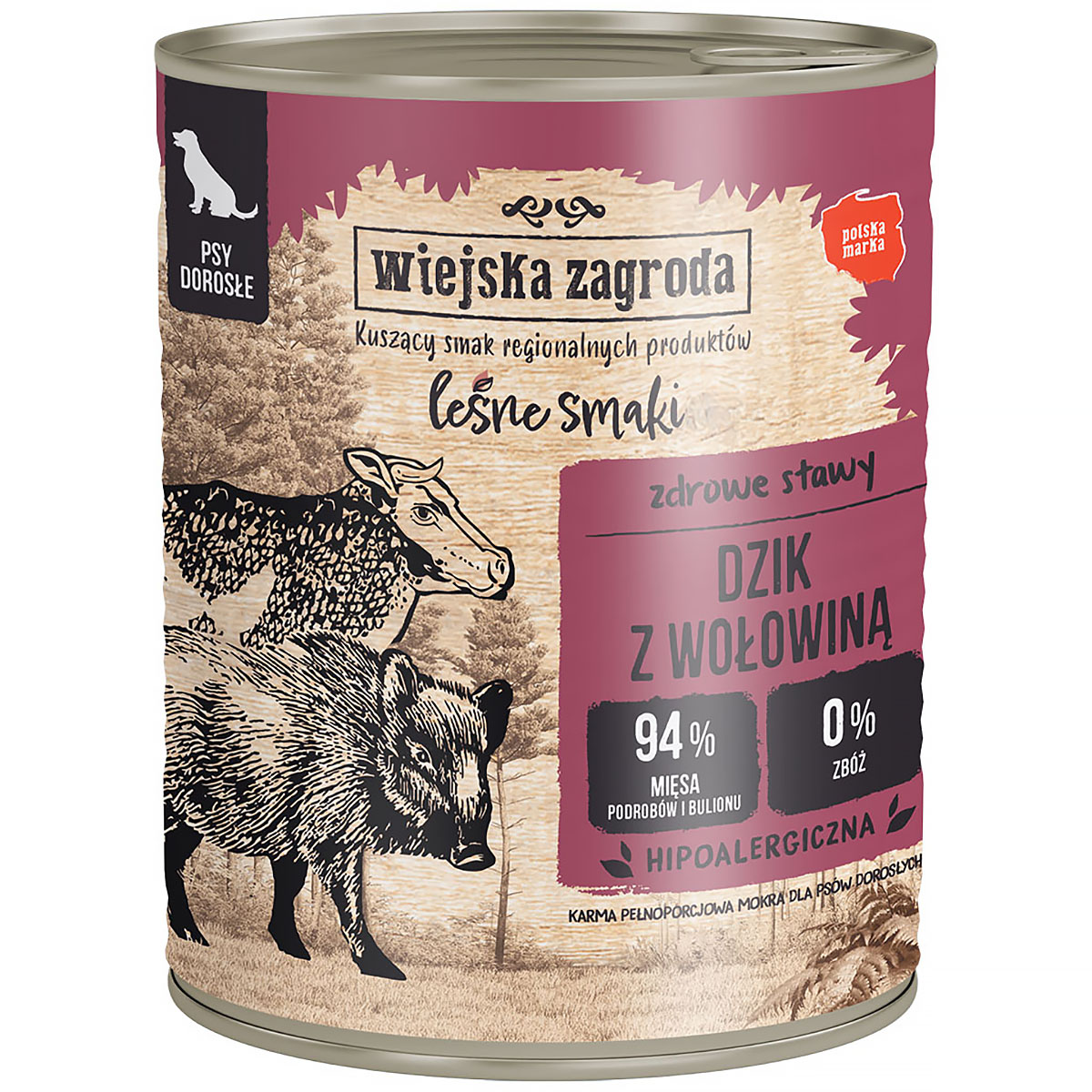 Karma dla psa na bazie mięsa z dzika jest wyjątkowo smaczna i aromatyczna. Dziczyzna ma niską zawartość tłuszczu i korzystny stosunek kwasów tłuszczowych nienasyconych do nasyconych. Dodatek mięsa z wołowiny jest źródłem dobrze przyswajalnego białka oraz żelaza. Mokra karma dla psa z dzikiem i wołowiną zawiera glukozaminę i siarczan chondroityny, które pozytywnie wpływają na kości i zapewniają zdrowe stawy. Karma z dzikiem i wołowiną to odpowiedni wybór dla aktywnych psów, które lubią długie spacery i aktywność na świeżym powietrzu.