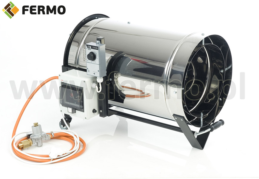 Zawór redukcyjny pozwala na płynne ustawienie mocy grzewczej na wybranym poziomie, poprzez zmianę ciśnienia gazu w palnik, natomiast termostat umożliwia precyzyjny nastaw żądanej temperatury. Co ważne, palnik nagrzewnicy jest odporny na zapylenie i nie wymaga częstego czyszczenia. Całość jest odporna na trudne warunki panujące w obiektach inwentarskich. Obudowa nagrzewnicy wykonana jest ze stali nierdzewnej. Nagrzewnice do obiektów inwentarskich posiadają niewielkie rozmiary, a kółka i rączka ułatwiają transport urządzenia.