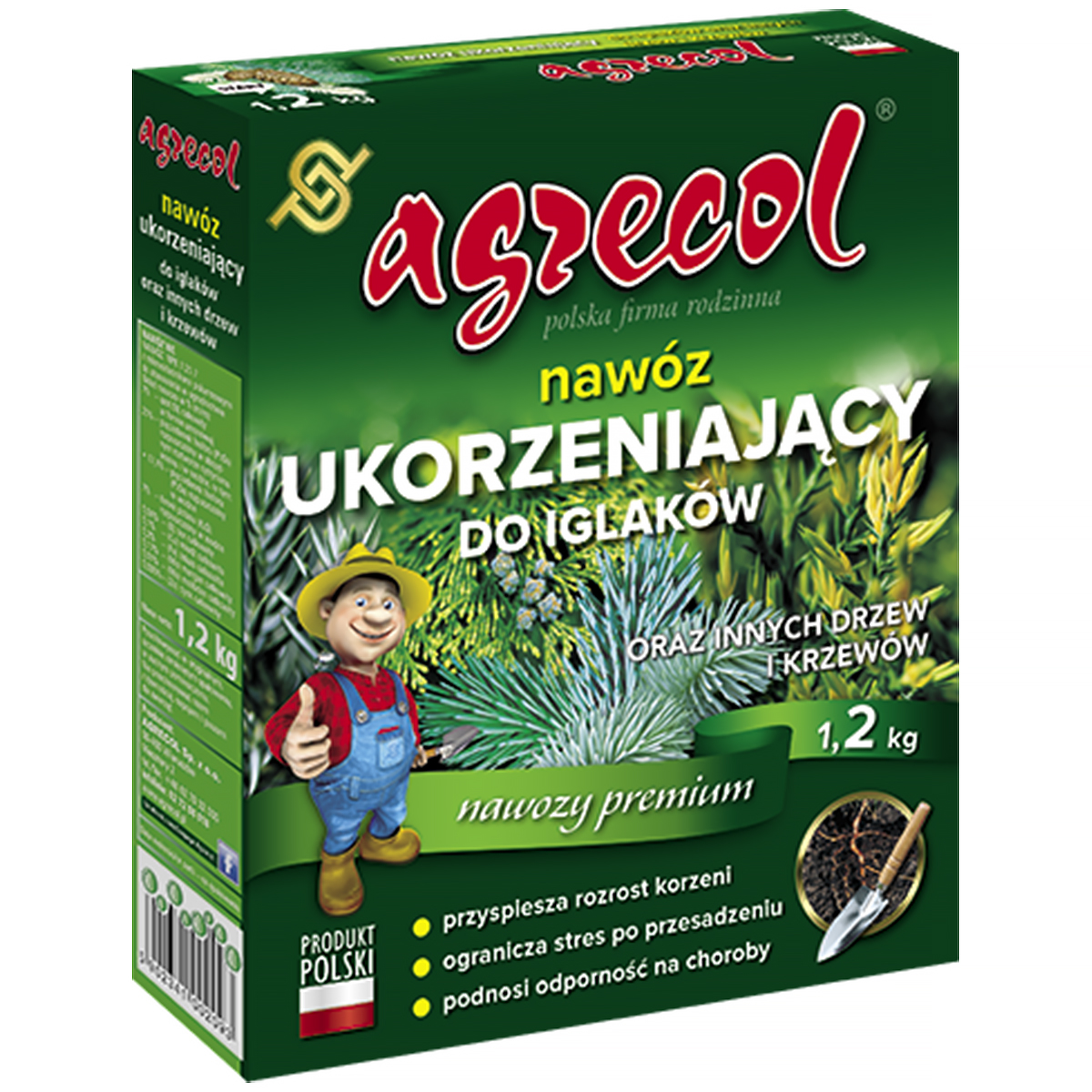 Nawóz do ukorzeniania iglaków Agrecol w opakowaniu 1,2 kg. Nawóz typu WE, polecany do ukorzeniania i przesadzania roślin iglastych, różaneczników oraz innych drzew i krzewów iglastych. Pełnowartościowy nawóz mineralny w formie granulatu jest wydajny oraz wygodny w dozowaniu. Opakowanie 1,2 kg wystarcza na 100 litrów podłoża. Bogaty skład nawozu do ukorzeniania różaneczników, wywiera korzystny wpływ na budowę systemu korzeniowego iglaków oraz podnosi odporność roślin na choroby.