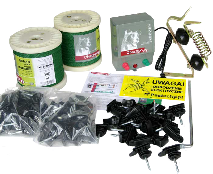 Do zestawu dołączone są dwie rolki (200 m) zielonej taśmy o szerokości 10 mm. Taśma Ruban gwarantuje świetne przewodnictwo elektryczne. Przewód tworzą włókna polietylenowe oraz druciki ze stali nierdzewnej. Taśma posiada zielony kolor, jest doskonale widoczna dla zwierząt oraz ludzi. Co więcej, bardzo dobrze dopasowuje się do otoczenia, nie szpeci otoczenia.