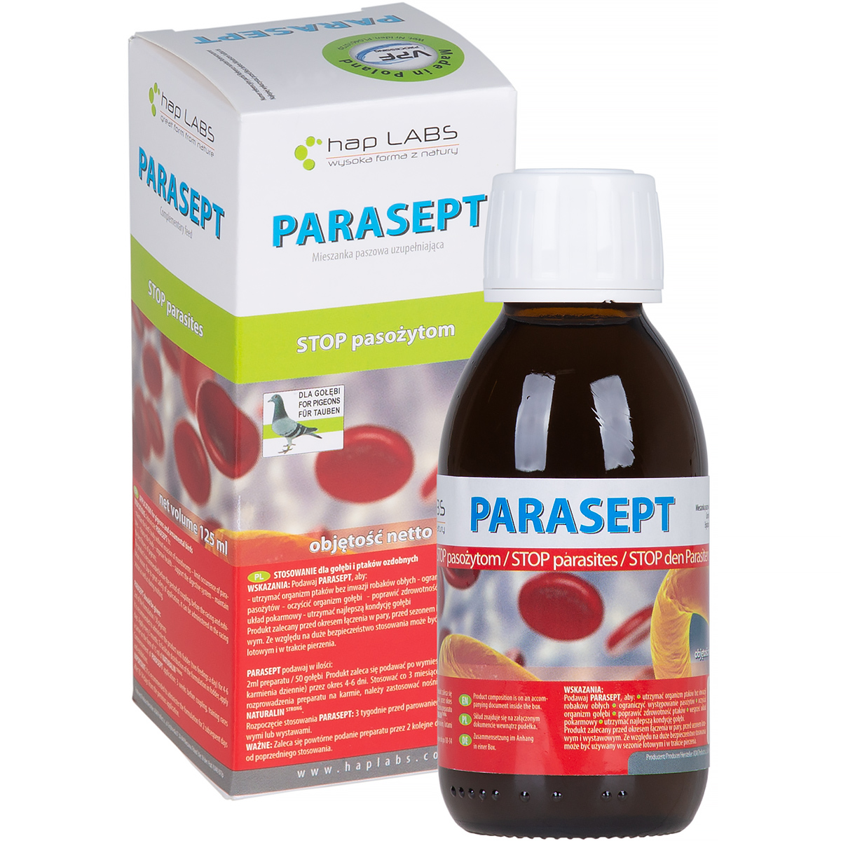 Odrobaczający preparat PARASEPT dla gołębi to kompozycja specjalnie dobranych wyciągów ziołowych o działaniu przeciw pasożytniczym. Ten środek odrobaczający z łatwością pokona glisty, kapilarię czy tasiemce. Dodatkowo, dzięki temu, że preparat ma naturalny skład skutecznie wspiera odporność oraz oczyszcza organizm z toksyn, nie wywołując środków ubocznych. Produkt ten chroni również organizm gołębi przed wtórnym zatruciem pasożytami, a także usuwa grzyby i bakterie, które przebywają w przewodzie pokarmowym ptaków.