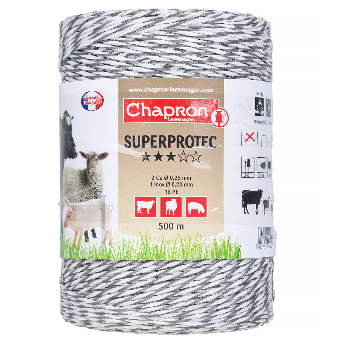 Prezentowana plecionka do pastuchów elektrycznych SUPERPROTEC dedykowana jest szczególnie do długich ogrodzeń dla krów, owiec, bydła mięsnego oraz przeciw zwierzynie leśnej. Doskonałe parametry przewodnictwa elektrycznego są zasługą użytych do produkcji drutów przewodzących miedzianych oraz ze stali nierdzewnych.