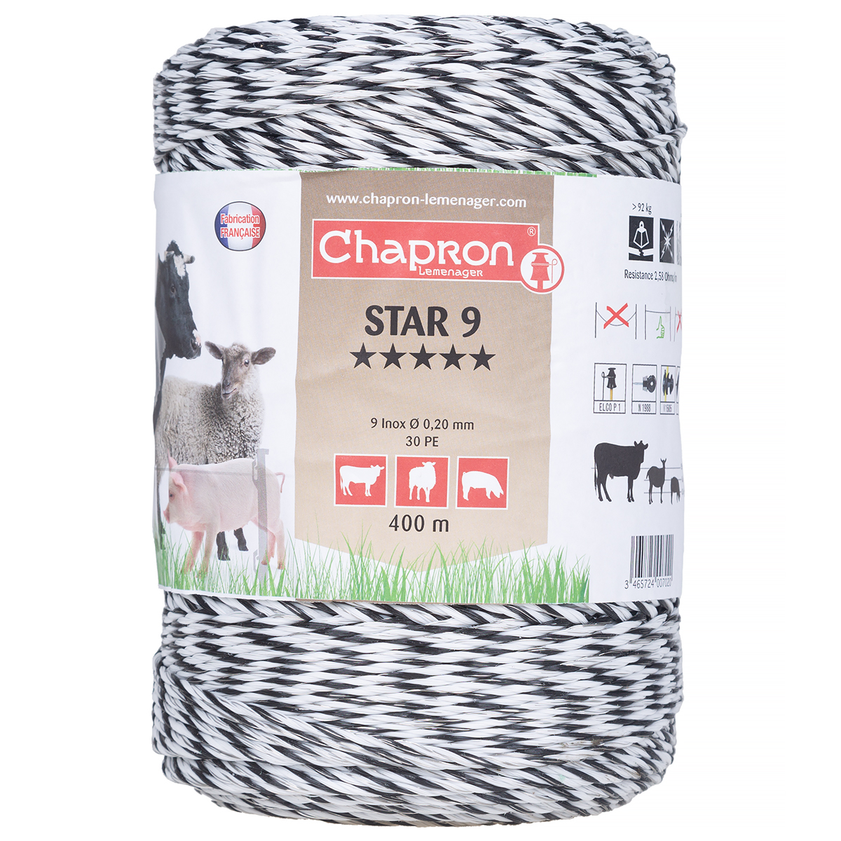 Najwyższej jakości plecionka przewodząca w kolorze biało-czarnym. Przeznaczona została do długich oraz bardzo długich ogrodzeń elektrycznych do długości ok.37km. Nadaje się niemal do wszystkich zwierząt, a zwłaszcza dla bydła, koni, kóz czy owiec. Idealnie sprawdzi się do ochrony upraw oraz hodowli przed wtargnięciem niepożądanych gości. Plecionka elektrycznego pastucha występuje w kolorze biało-czarnym, co zapewnia doskonałą widoczność ogrodzenia zarówno przez ludzi, jak i przez zwierzęta. Plecionka elektrycznego pastucha STAR 9 -400m wraz z elektryzatorem stanowi doskonałą barierę przed niechcianymi gośćmi.