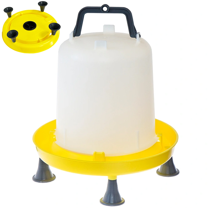 Poidło dla kur z korkiem o pojemności 10 l. Tego typu pojnik polecany jest dla małych i średnich przydomowych hodowli. Doskonale sprawdza się do pojenia kur, brojlerów, kaczek, gęsi, indyków, perlic, przepiórek, ptactwa ozdobnego. To co wyróżnia go spośród innych poideł dostępnych na rynku to duża średnica misy, dzięki której wiele ptaków może jedocześnie pić wodę. Dla hodowcy dużym ułatwieniem jest korek, który pozwala na wygodne uzupełnienie wody, bez konieczności oddzielania spodu od zasobnika. Poidło o pojemności 10 l z powodzeniem obsłuży 20 kur, a wody w nim powinno wystarczyć na ok. 2 dni.
