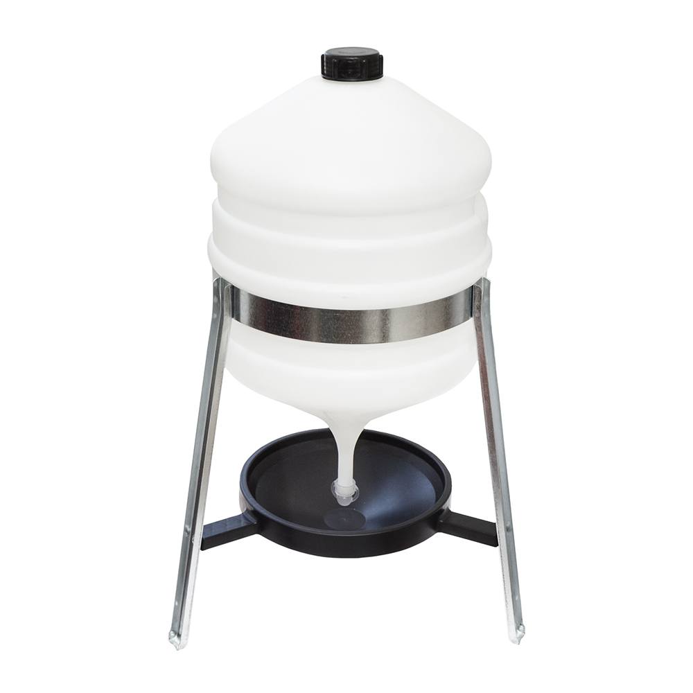 Największe poidło zbiornikowe dla drobiu dostępne na naszym rynku. Duży zasobnik wykonany z mocnego tworzywa sztucznego zapewnia zaopatrzenie w wodę pitną na dłuższy czas. W zależności od obsady i liczby poideł przewidzianych na 100 sztuk drobiu zbiornik wystarcza nawet do kilku dni. Obszerna i głęboka misa oraz jej umiejscowienie na odpowiedniej wysokości sprawia, iż pobieranie wody jest łatwe i bezproblemowe. Zarówno misa, zawór i zasobnik wykonane są z tworzywa sztucznego co sprawia, iż poidło idealnie nadaje się do podawania, witamin, antybiotyków, kwasów i związków mineralnych.