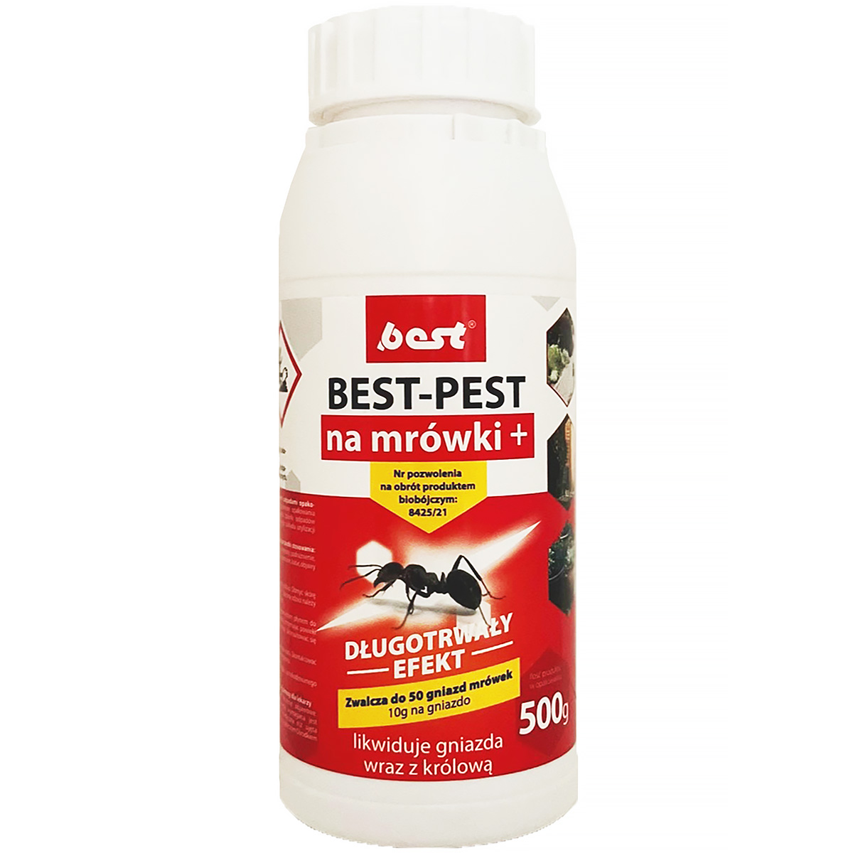 Best Pest na mrówki 500 g to skuteczny preparat do zwalczania tych szkodników w pomieszczeniach, tarasach, balkonach lub altanach. Wszędzie tam gdzie mrówki są nieproszonymi gośćmi. Best Pest na mrówki to proszek gotowy do użycia, przeznaczony do zwalczania wszystkich gatunków mrówek.