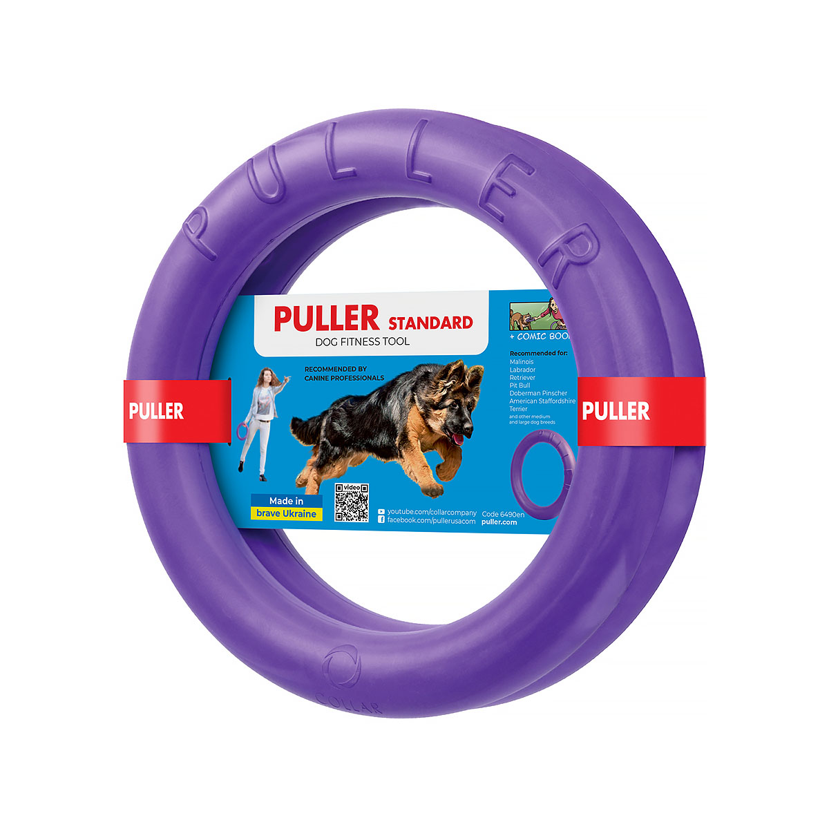 PULLER STANDARD zabawka treningowa dla psa dużych ras to idealnie przystosowana i zapewniająca ogrom zabawy i odpowiednią aktywność fizyczną zabawka. Zestaw dwóch piankowych obręczy, które zostałyopracowane przez profesjonalnych hodowców to doskonała alternatywa nie tylko dla zwykłych zabawek, ale również dla profesjonalnych narzędzi przystosowanych to tresury czworonogów. Puller Standard przeznaczony jest dla dorosłych psów dużych ras o wadze od 25 kg do 30 kg, takich jak: American Staffordshire Terrier, Doberman, Bull Terrier, Labrador Retriever, Cane Corse, Owczarek Belgijski Malinois, Pit Bull, Sznaucer Olbrzymi.