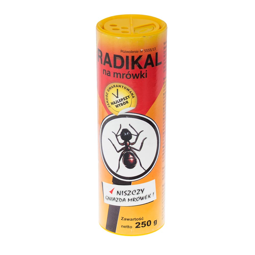 Środek na mrówki RADIKAL występuje w wygodnej postaci granulatu. Wewnątrz granulek znajduje się substancja czynna cypermetryna, która działa na insekty kontaktowo i żołądkowo. Skuteczność działa środka Radikal obserwuje się już po 1 dniu od stosowania.W preparacie zawarta jest również gorzka substancja benzoesan denatonium, która chroni zwierzęta domowe przed przypadkowym spożyciem.
