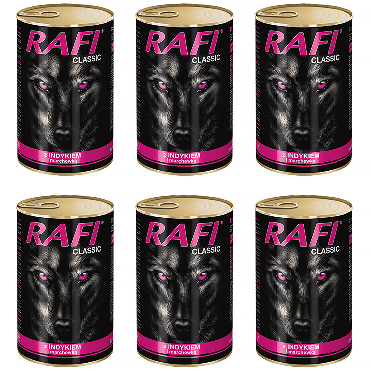 Karma dla psów Rafi Classic z indykiem i marchewką w puszkach 6 x 1240 g.Karma przeznaczona jest dla dorosłych psów każdej rasy oraz wielkości. Ze względu na bogate walory smakowe karma jest chętnie spożywana przez czworonogi.