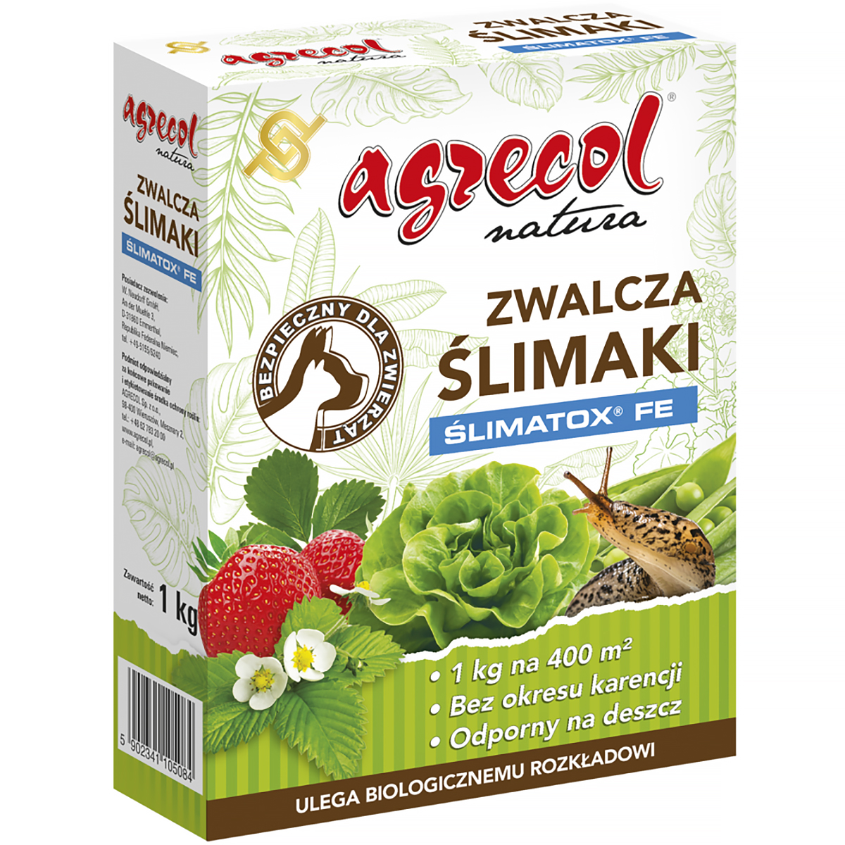 Ślimatox FE Agrecol to naturalny preparat w formie granulatu przeznaczony do zwalczania ślimaków nagich w gruncie i pod osłonami. Ślimtox FE w opakowaniu 1 kg jest środkiem ochrony roślin z grupy Moluskocydów. Granulat na ślimaki jest forma przynęty łownej, która wabi ślimaki i jest przez nie chętnie zjadana. Środek zawiera substancję czynną występującą naturalnie w środowisku i ulega biologicznemu