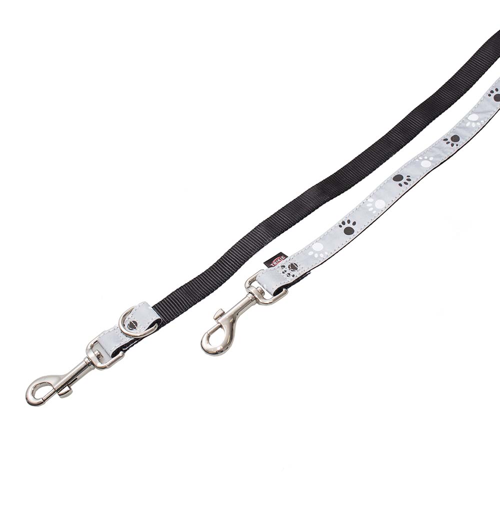 Smycz dla dużych psów została wykonana z wysokiej jakości nylonu. Grafika w łapki zapewnia estetyczny wygląd. W obrożę wszyta jest odblaskowa taśma, która gwarantuje dobrą widoczność po zmroku i w ciemności, zapewniając bezpieczeństwo podczas wieczornych spacerów. Za pomocą karabińczyka smycz jest dopinana do obroży bądź szelek.