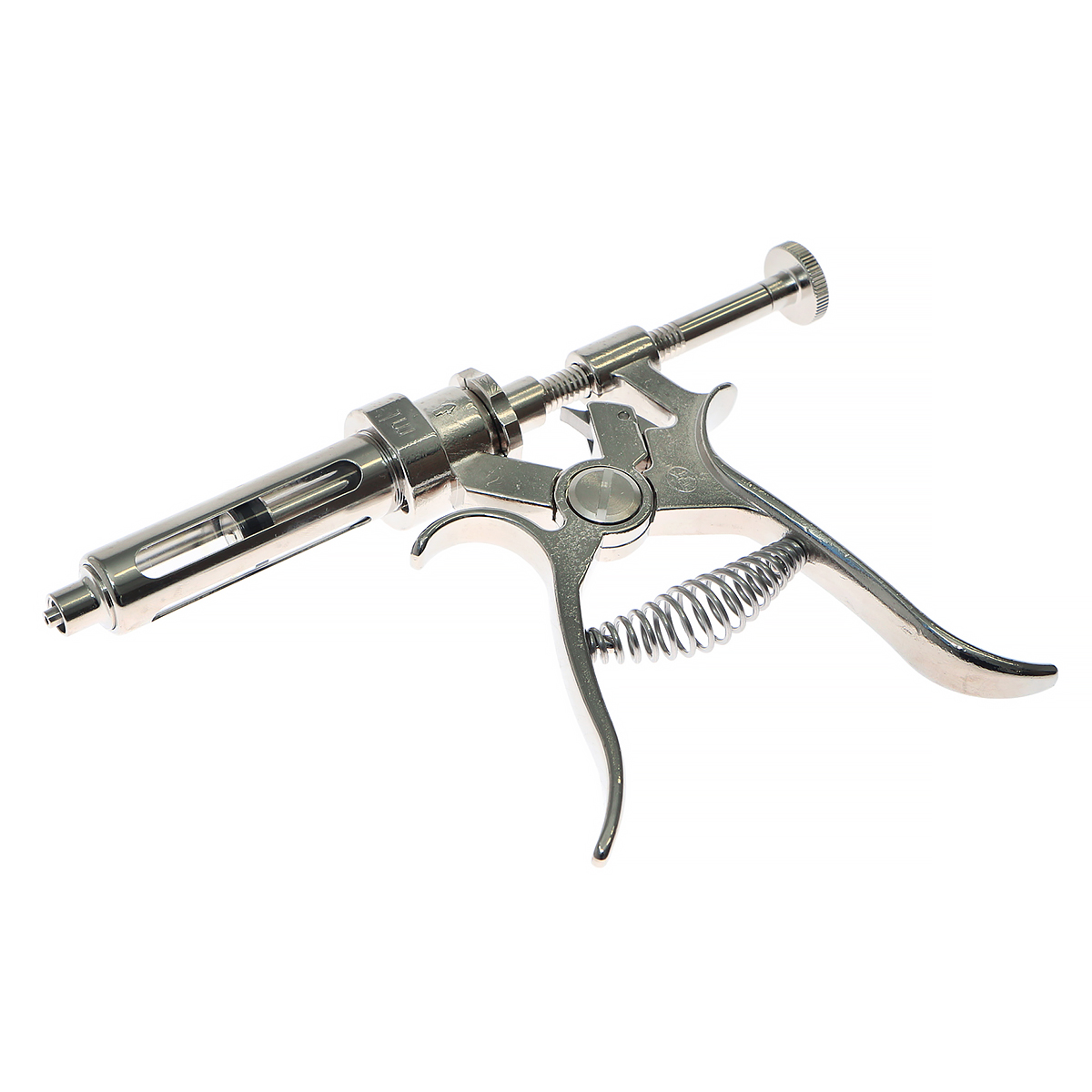 chromowany i polerowany mosiądz oraz szkło. Strzykawka uzupełniana w sposób ręczny - po odbezpieczeniu i pociągnięciu trzpienia tłoku .Oferowana strzykawka weterynaryjna przystosowana jest do mocowania