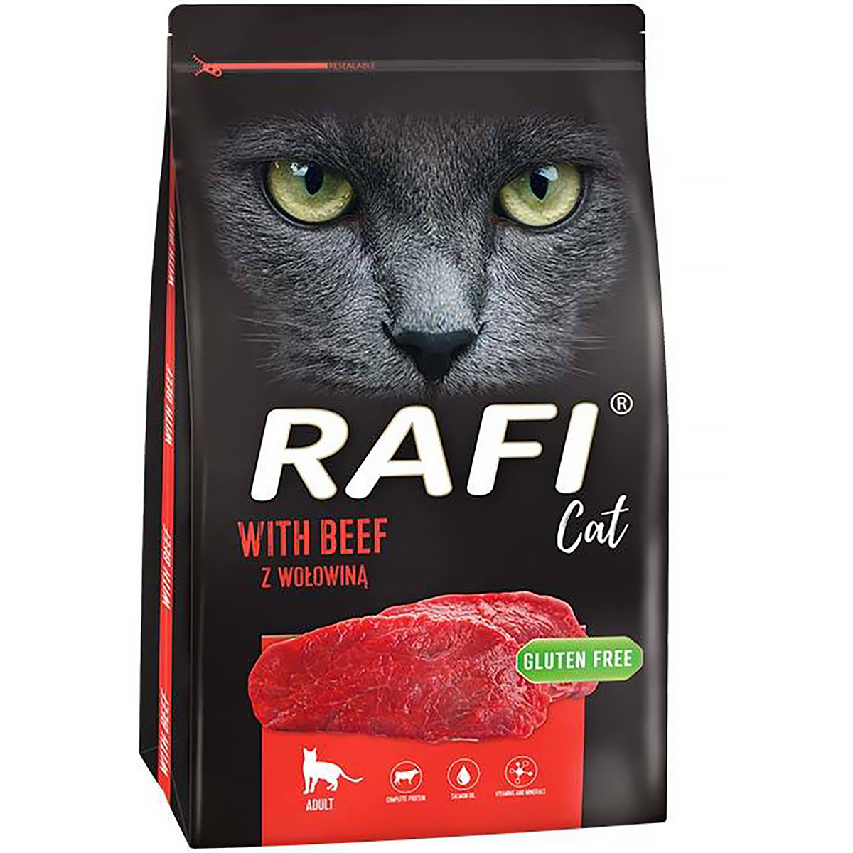 Sucha karma dla kota bez zbóż Rafi Cat z wołowiną 7 kg to doskonały wybór dla Twojego kota, szczególnie po zabiegu sterylizacji, kiedy dieta odgrywa kluczową rolę w utrzymaniu jego zdrowia i kondycji. Sucha karma Rafi Cat to pełnowartościowa sucha karma przeznaczona dla dorosłych kotów. Dzięki bogatemu i w pełni naturalnemu składowi możemy być pewni, że Rafi w pełni zaspokoi wszystkie potrzeby żywieniowe naszych pupili. Dodatkowo ta wyjątkowa sucha karma jest bezzbożowa, co doskonale wpływa na układ pokarmowy naszych kotów, eliminując jednocześnie ryzyko wystąpienia alergii pokarmowych.