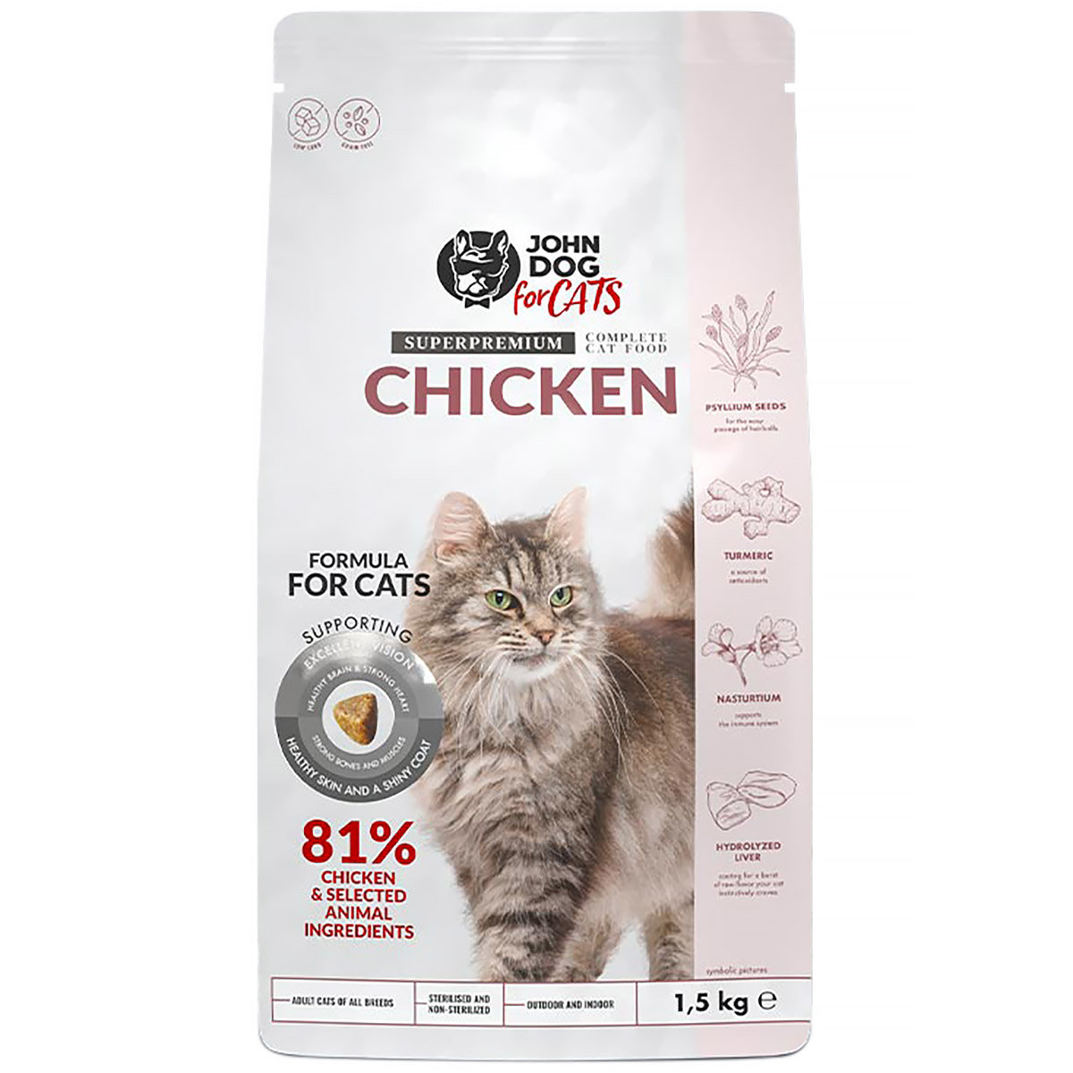 Sucha karma dla kota John Dog for Cats kurczak 1,5 kg dorosłe koty to pełnowartościowy posiłek dla naszych pupili, który nazywany jest mianem karmy superpremium. Dzięki starannie wyselekcjonowanym składnikom koci posiłek idealnie nadaje się dla wszystkich czworonogów, niezależnie od rasy. Dzięki doskonałej formule i zbilansowanemu składowi karma John Dog stanowi świetne uzupełnienie codziennej diety kota, bogatej w ważne dla rozwoju organizmów naszych kotów witaminy, minerały i składniki odżywcze.