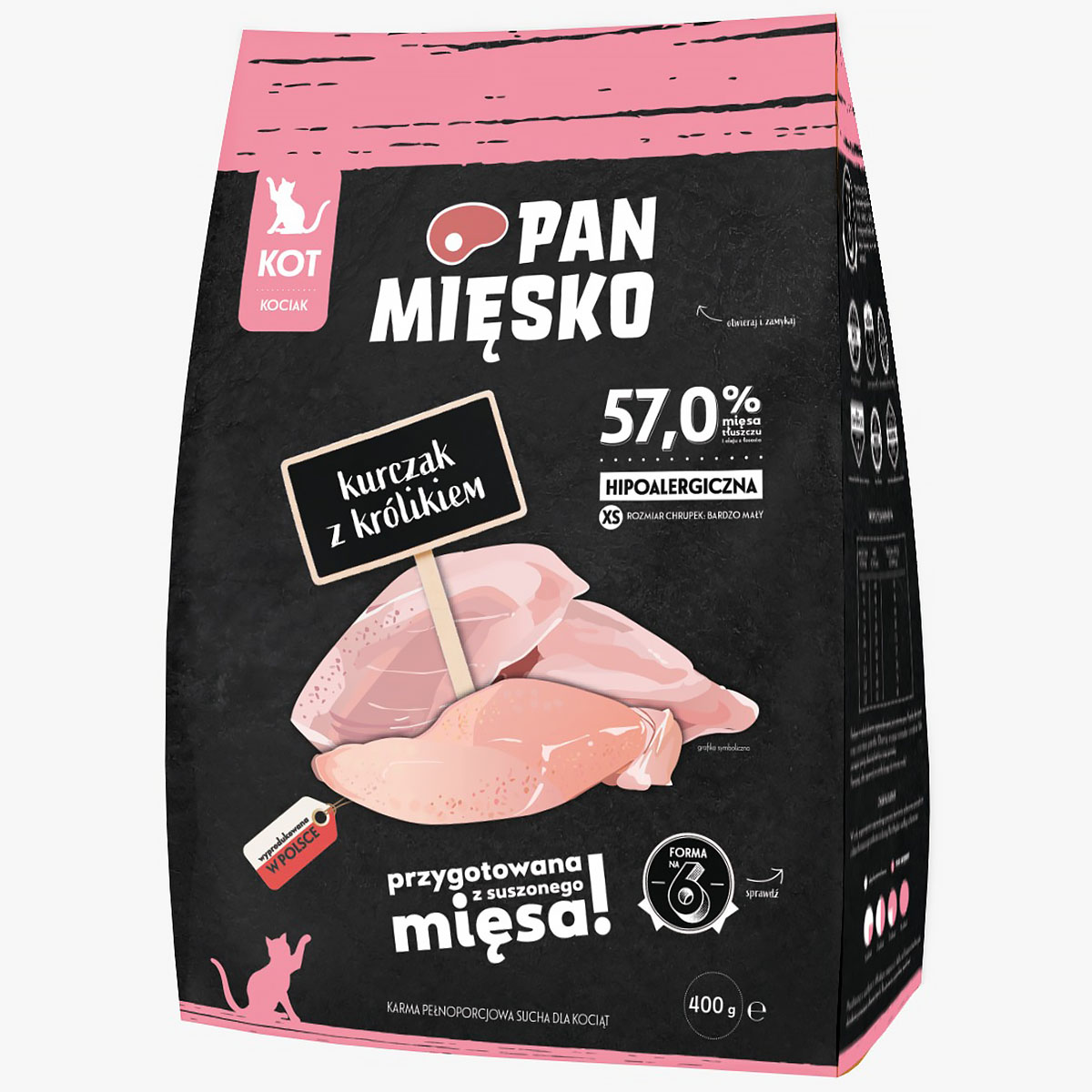 Idealna sucha karma dla kociąt wszystkich ras z tendencją do alergii pokarmowych. Hipoalergiczna karma dla kota Pan Mięsko, to wszystko co najlepsze w pożywieniu dla Twojego Pupila. Dwa gatunki delikatnych i lekkostrawnych mięs, to idealne połączenie w żywieniu małych kociąt, po odstawieniu od mleka matki. Zarówno mięso z królika, jak i z kurczaka dostarczają wysokowartościowego białka, witamin i minerałów, ważnych dla właściwego rozwoju małych mruczków. Przy tym naturalny, odpowiednio zbilansowany skład jest właściwy dla delikatnych małych brzuszków kociąt.